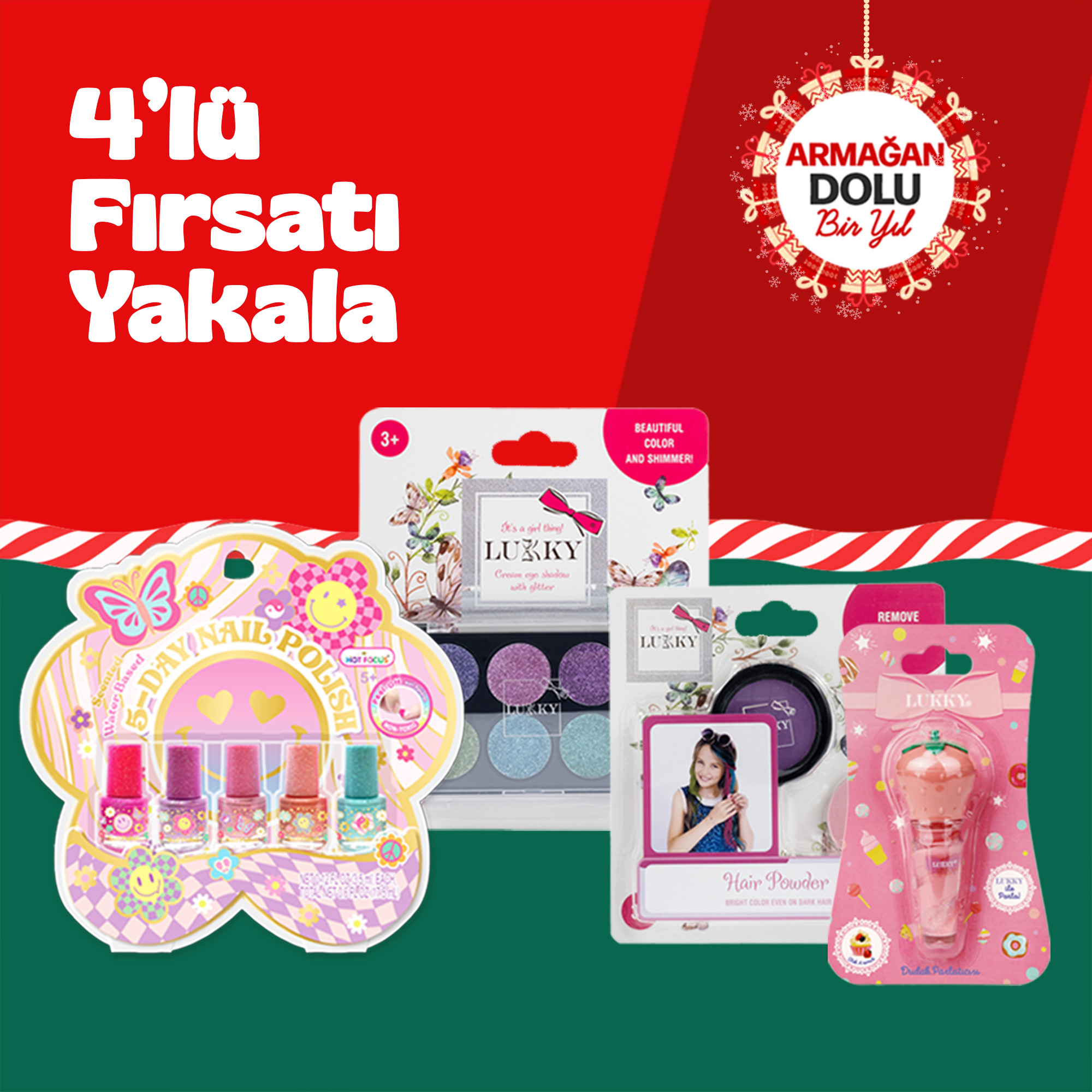 Yeni yıl kutlamalarında tarzını ve ışıltını ön plana çıkarmak isteyenler için özel hazırlanmış bu dörtlü kozmetik bundle, makyajdan saç stiline, tırnaklardan dudaklara kadar komple bir güzellik deneyimi sunuyor.