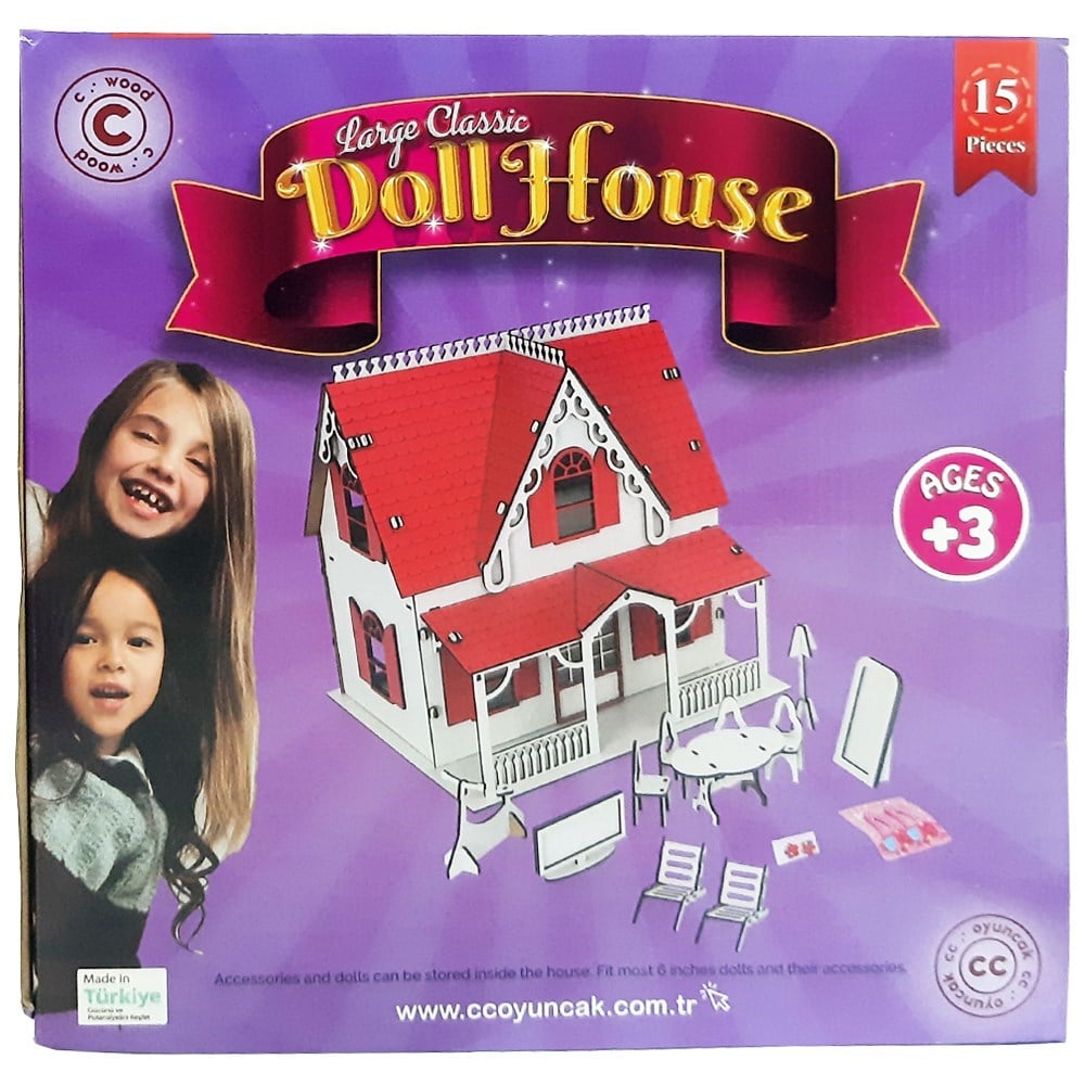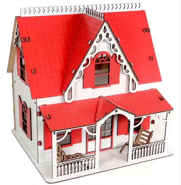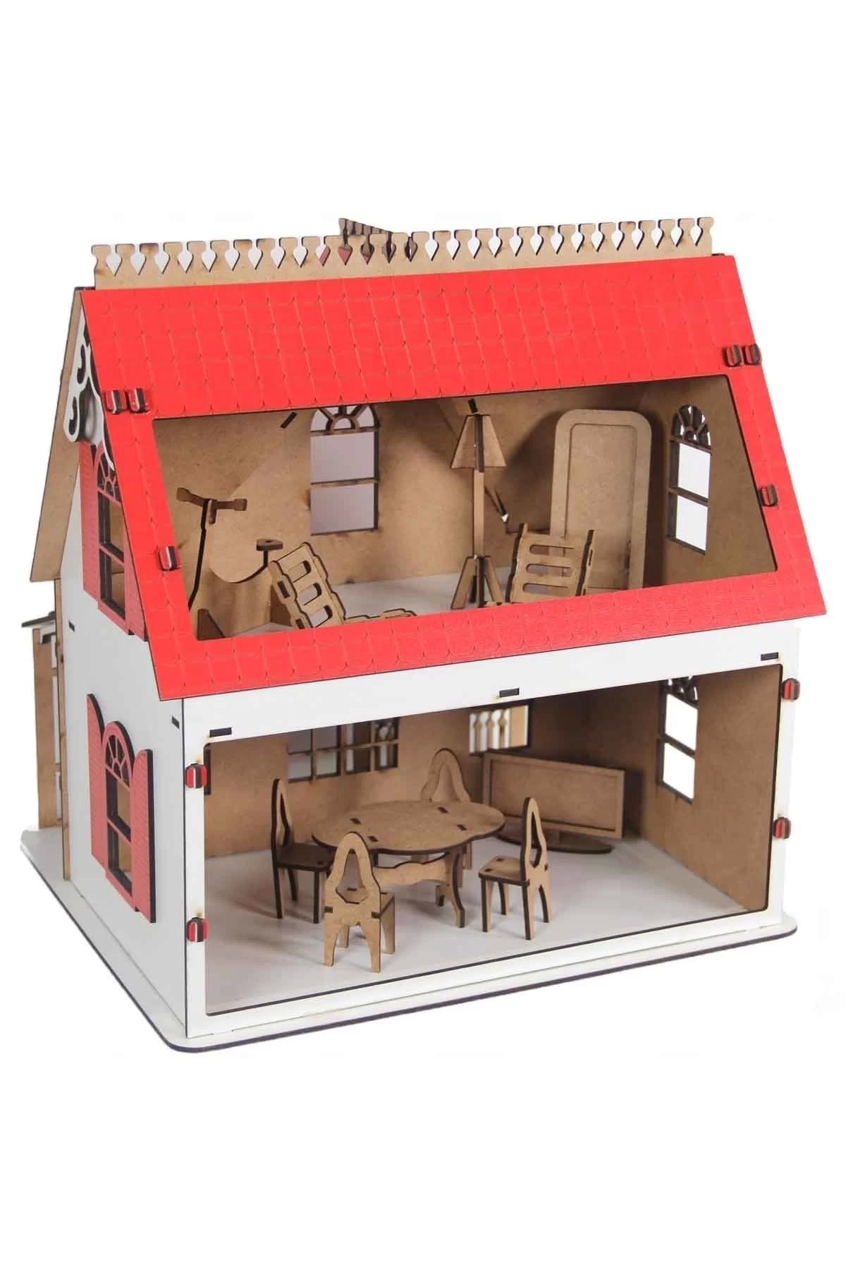 Oyuncak Ahşap Kırmızı Villa Ev 15 Parça Çocukların seveceği