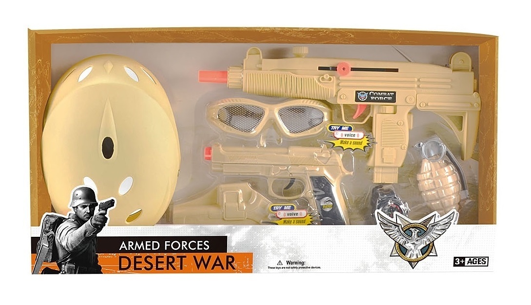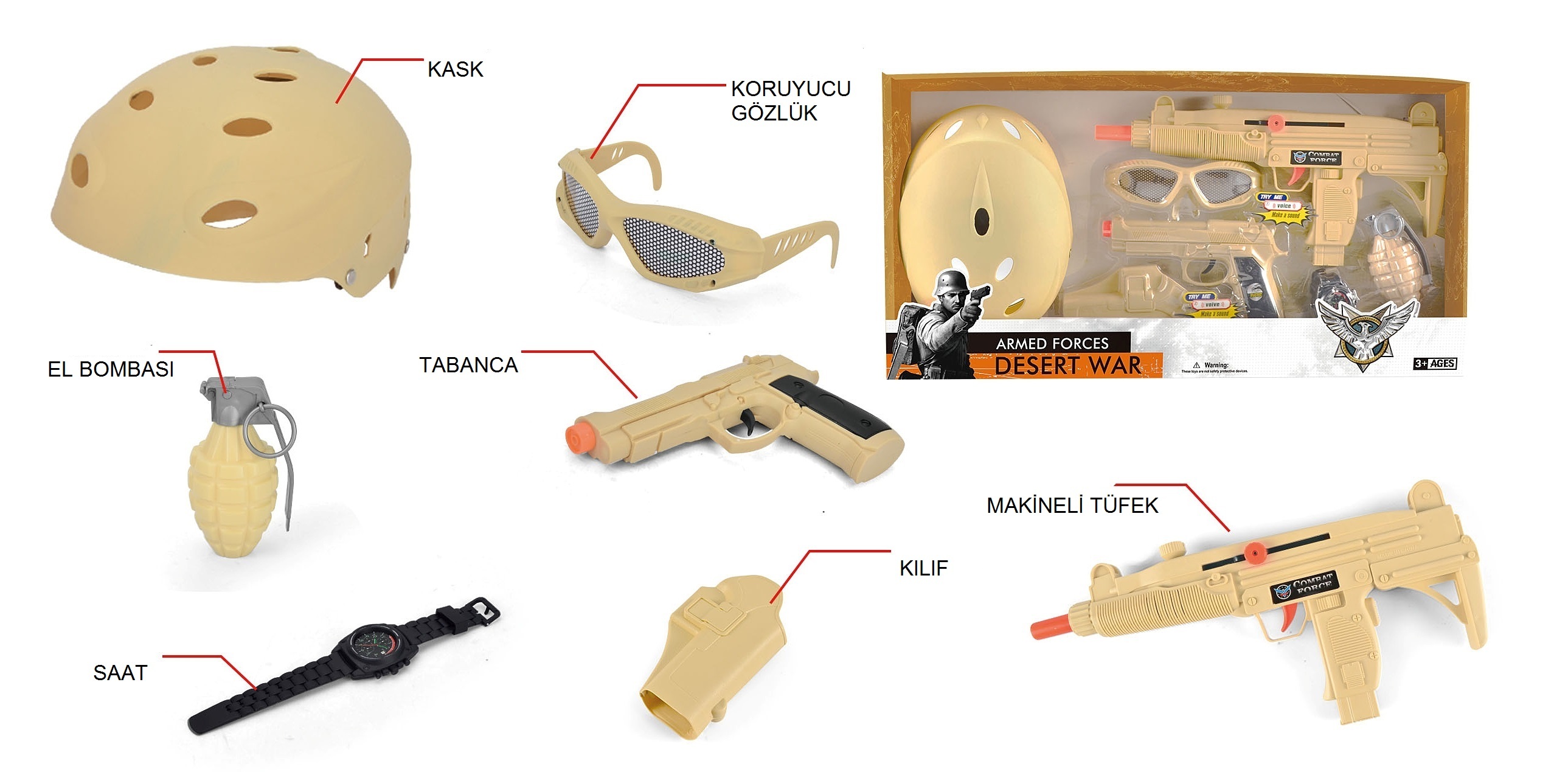1 kask, 1 gözlük, 1 el bombası, 1 komando tüfeği, 1 polis tabancası, 1 kılıf ve kol saati bulunmaktadır.