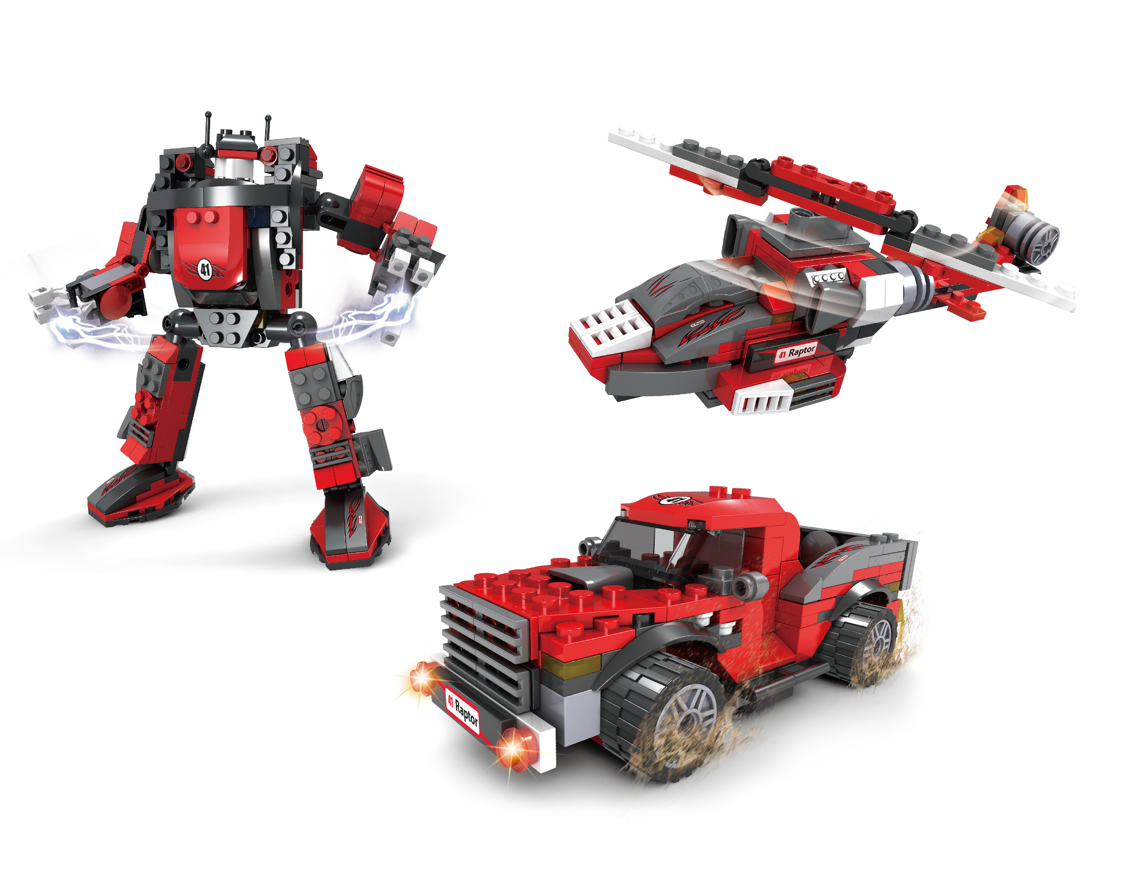 Filmden fırlamış bir robot, güçlü bir arazi aracı ve benzersiz bir helikopter olmak üzere 3 farklı oyuncağı yap ve hemen oynamaya başla!