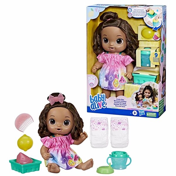 3 yaşındaki kız çocuklarına yönelik 30 cm boyundaki bu beslenebilir oyuncak bebek, çocukların sıkıp suyunu çıkarabileceği 2 plastik meyve (elma ve ananas) ve oyuncak meyve sıkacağı gibi Baby Alive aksesuarlarıyla birlikte gelir.