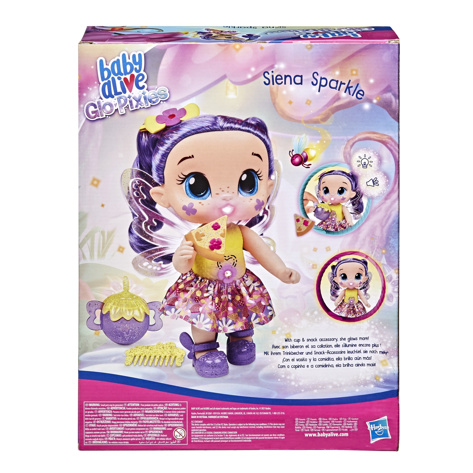 Siena Sparkle adlı oyuncak bebeği besliyormuş gibi yaparak özel renkli parıltısını keşfedin.
