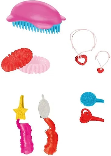 Çeşitli kıyafet ve aksesuarlar : tişört, tül etek, tayt, ayakkabıyla birlikte saç fırçası, 2 adet spiral saç tokası, 2 adet saç tokası, 2 adet saç tokası, bir oyuncak bebek arkadaşlık bileziği.