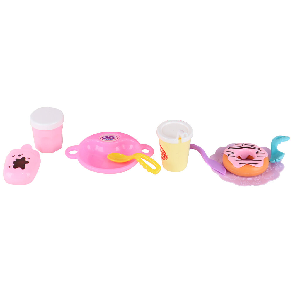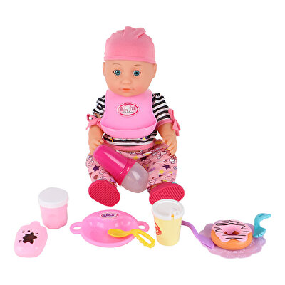 Set şunları içerir: Bir oyuncak bebek, mama sandalyesi, biberon, suluk, yemek aksesuarlarından oluşmaktadır.
