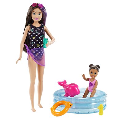 Havuz eğlencesine hazır küçük çocuk ve Skipper bebeğin yanı sıra bebek bakıcılığına ve hikaye anlatımına teşvik eden ek aksesuarlar sete dahildir.