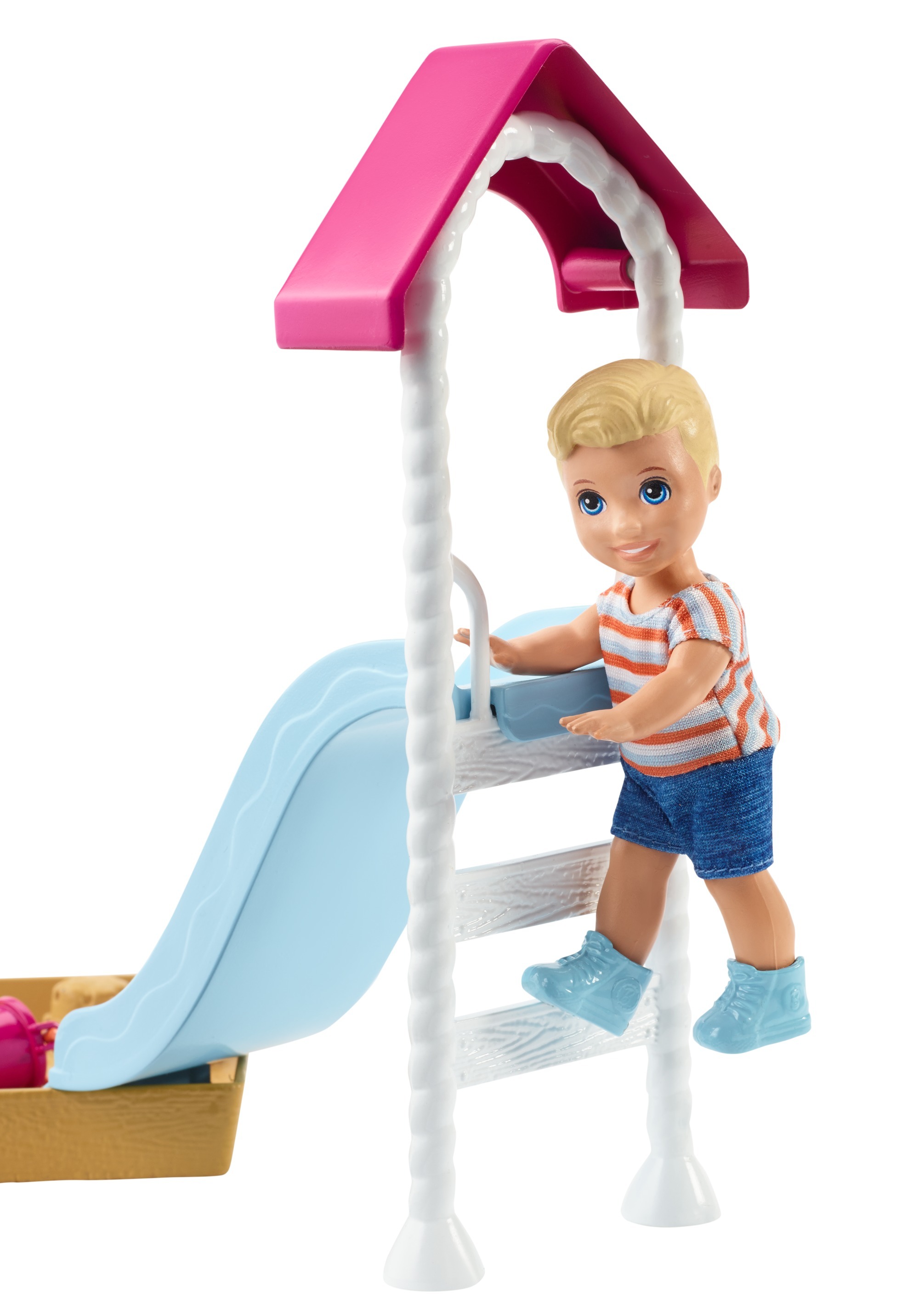 Her sette bakılacak küçük bir oyuncak bebek (küçük çocuk veya bebek) ve dış mekanda bebek bakıcılığı eğlencesi için temalı bir oyun parçası bulunur.
