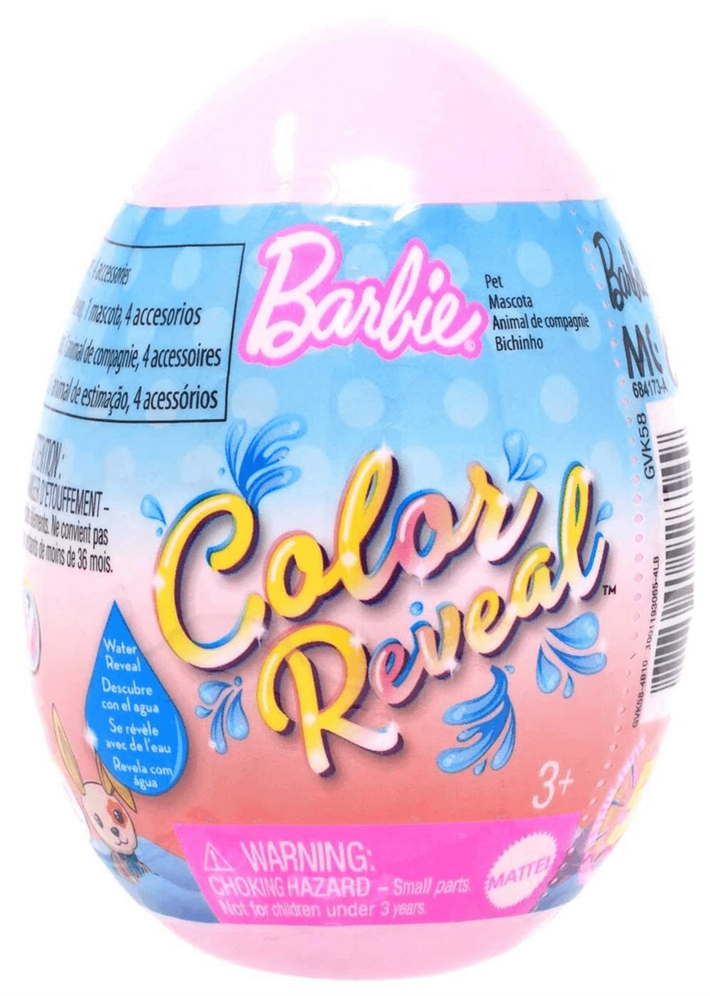 Pastel renkli yumurtanın içinde dört gizemli paket, paketlerin içinde ise Barbie Color Reveal Renk Değiştiren Sürpriz Hayvan Figürü ve üç adet