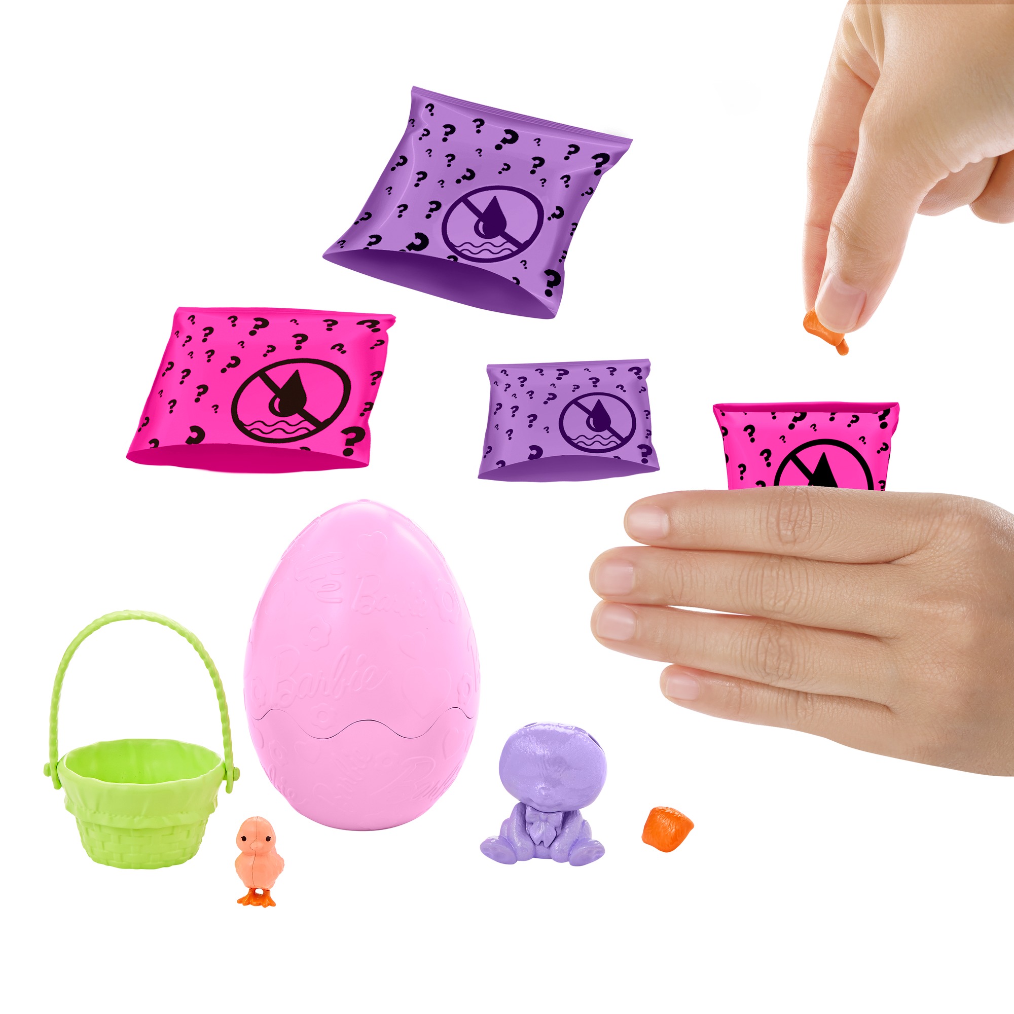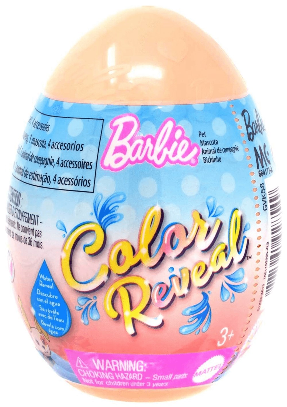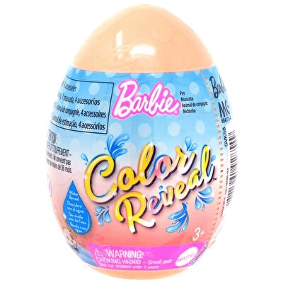 Pastel renkli yumurtanın içinde dört gizemli paket, paketlerin içinde ise Barbie Color Reveal Renk Değiştiren Sürpriz Hayvan Figürü ve üç adet gizemli aksesuar bulunur.