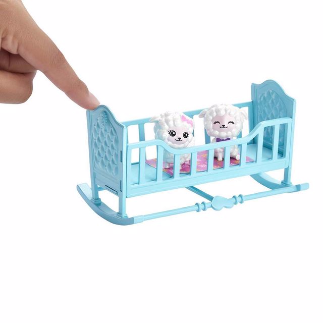 Bu şirin Barbie oyun setinde at arabasına benzeyen bir bebek arabası ile sallanan beşik gibi bakım oyununa ilham veren aksesuarlar, Skipper bebek ve iki kuzu bulunur.