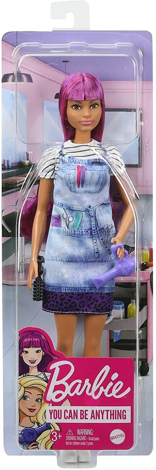 Mor saçlı Barbie Kuaför Bebek (30,40 cm) çizgili şirin bir tişört, bir önlük ve rahat ayakkabılar giyer.