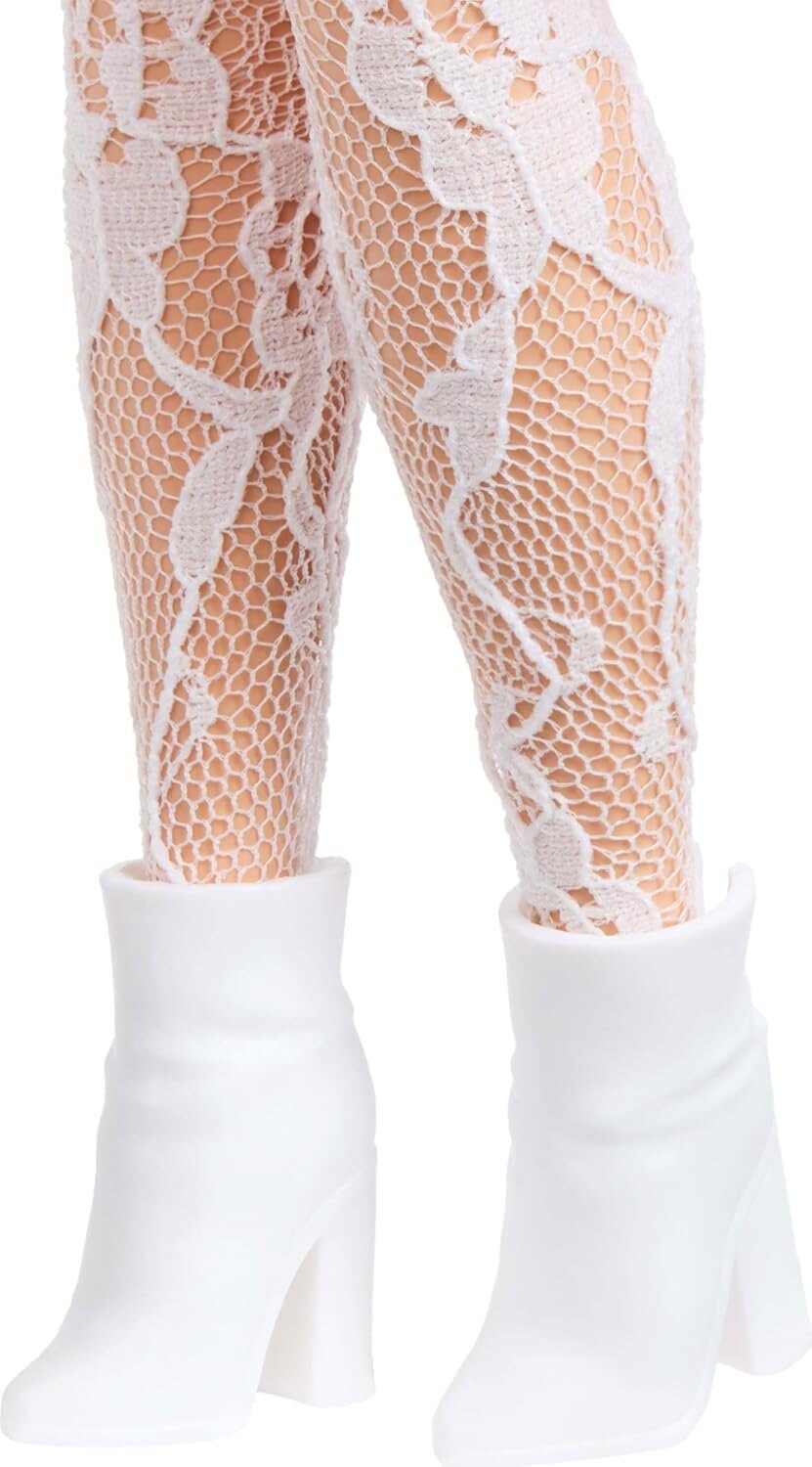Eklemleri bükülebilen bebeğin kalp desenli şık elbisesi, dantelli taytı, 'BARBIE' yazılı kemeri ve parlak çizmelerini çıkarabilirsiniz.