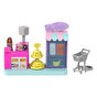 Oyun setinde ürün rafları, kasa bölümü ve alışveriş sepeti gibi etkileşimli oyun alanları ve 4 cm'lik mini bir Barbie bulunur. Mini bebek bel kısmından bükülebilir ve diğer Barbie evleri, araçları ve oyun setlerinin farklı yerlerine takılabilen, kalp şeklindeki tabanı üzerinde ayakta durabilir.