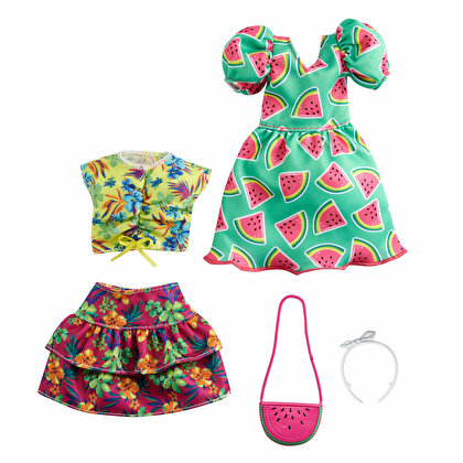 Bu ürün; iki giysi (tek parçalı bir elbise veya iki parça alt ve üst olabilir) ile Barbie'nin tarzını tamamlayan iki aksesuar içerir.