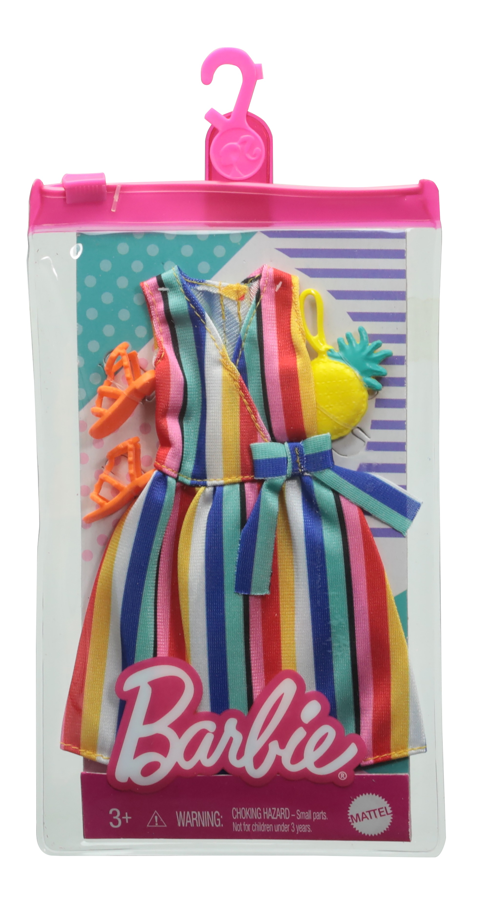 Bu ürün; bir giysi (tek parçalı bir elbise veya bir parça alt ve üst olabilir) ile Barbie'nin tarzını tamamlayan bir aksesuar içerir.