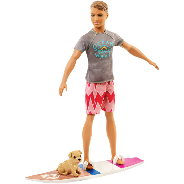 Ken, havalı sörf tahtası ve köpeğiyle birlikte gelir. Ken bebek son moda kıyafetleri ile tarzını konuşturuyor.