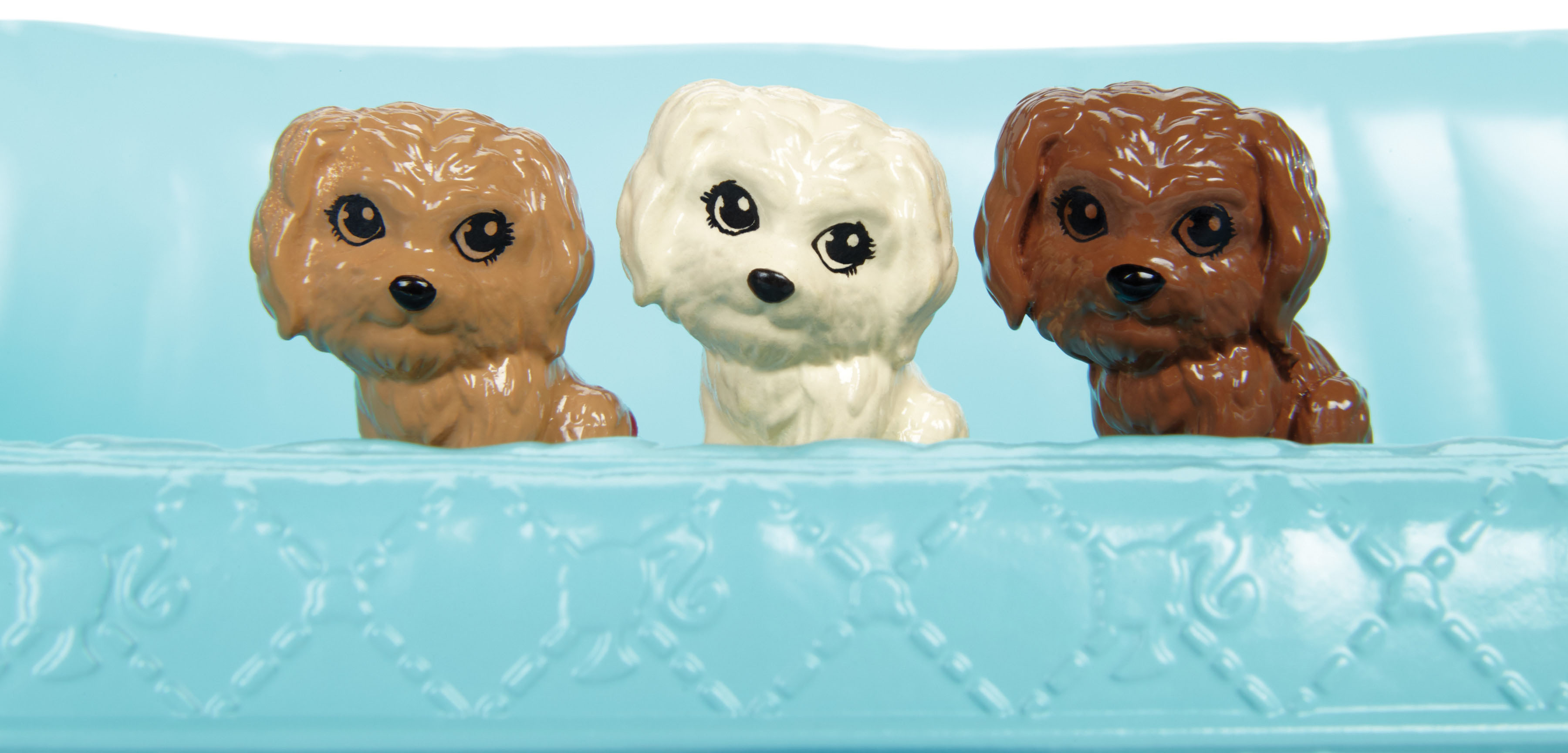 Oyun setine Barbie bebek, anne köpek, yavru köpekler ve köpek yatağı dahildir.