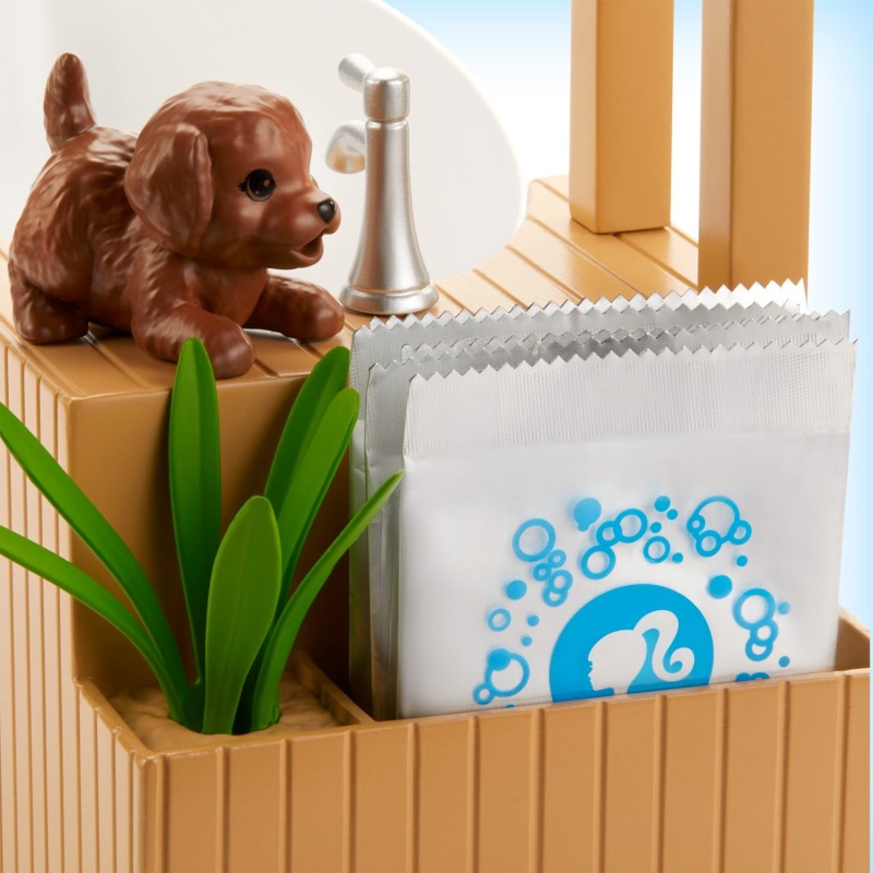Sette Barbie bebek, yavru köpek, spa küveti ve gerçek bir köpük banyosu için gereken aksesuarlar yer alır.