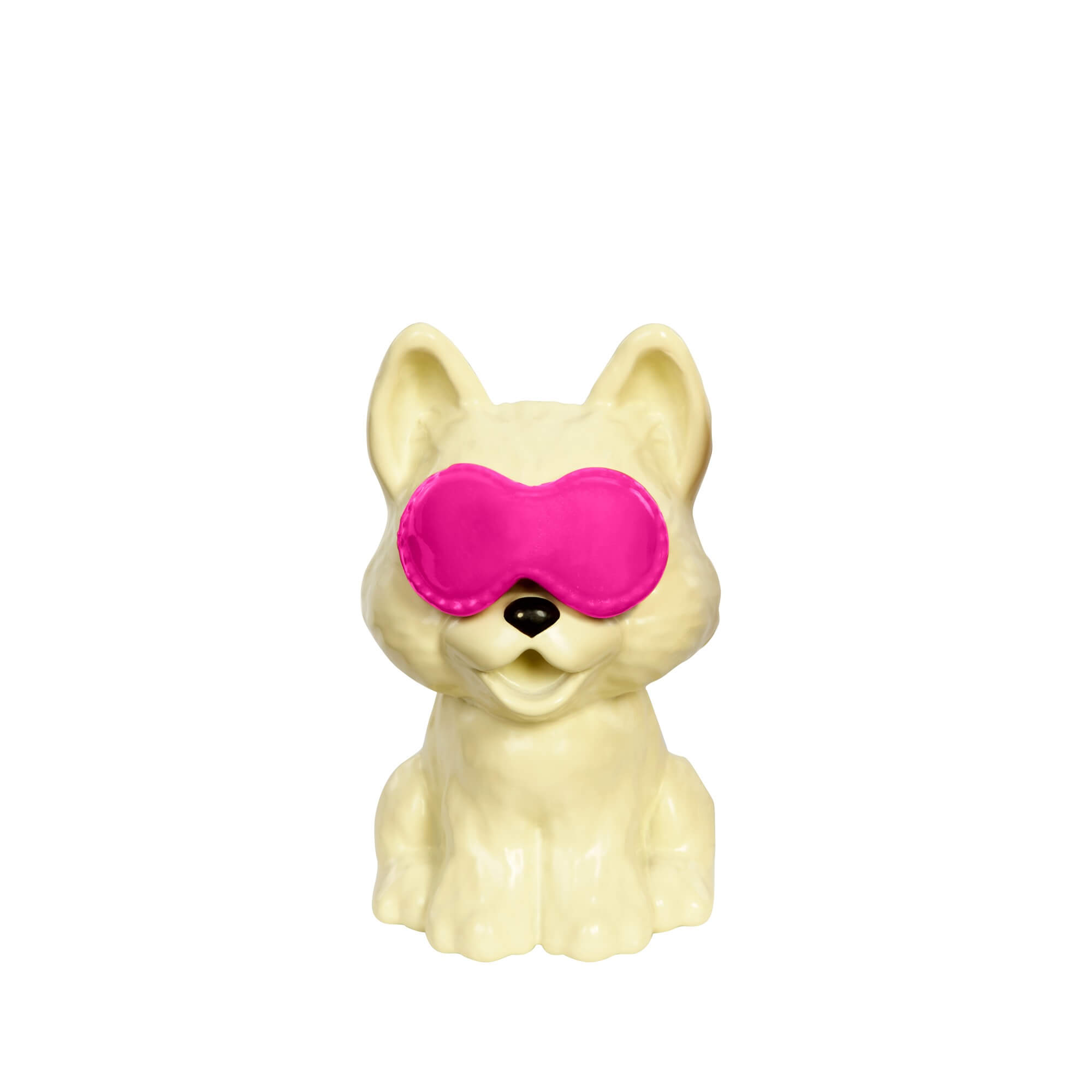 Oyun seti; Barbie, göz maskesiyle birlikte yavru köpek, lavabo ve ayna, arkaya yatabilen koltuk, havlu, 4 adet yüz maskesi, 4 adet yeniden kullanılabilir paket, hayvan temalı 3 adet göz maskesi, losyon şişesi, terlik ve saç bandı içerir.