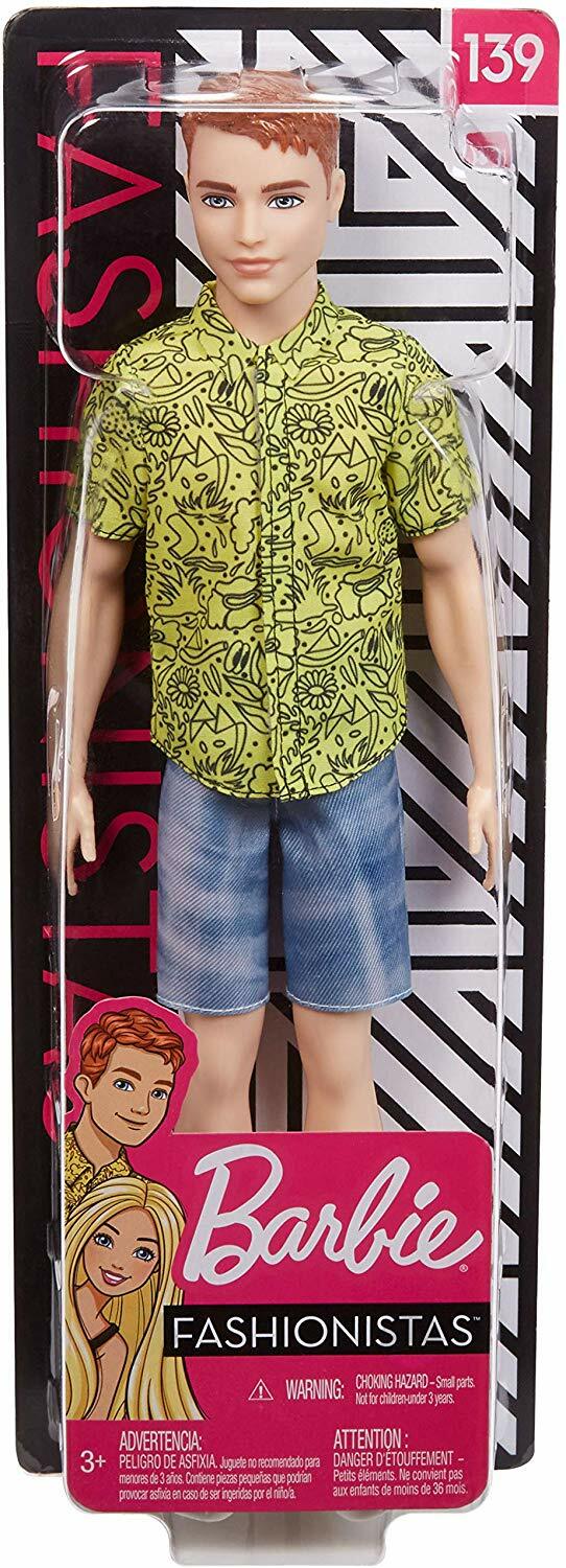 Ken bebek kızıl saçlı ve grafik tasarımlı sarı yakalı bir gömlek giyiyor.