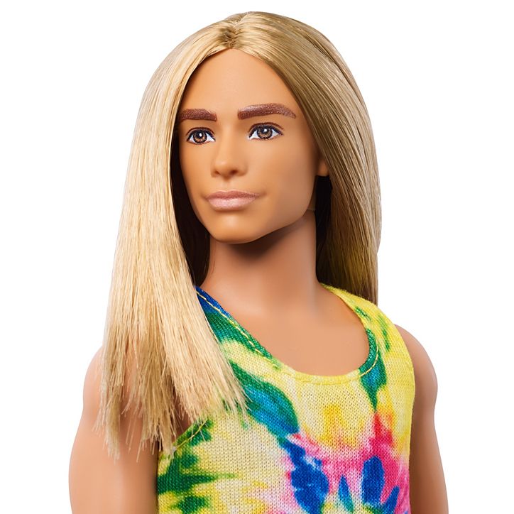 Ken bebek renkli bir kravat boyası, desenli atlet ve kot şort giyer.
