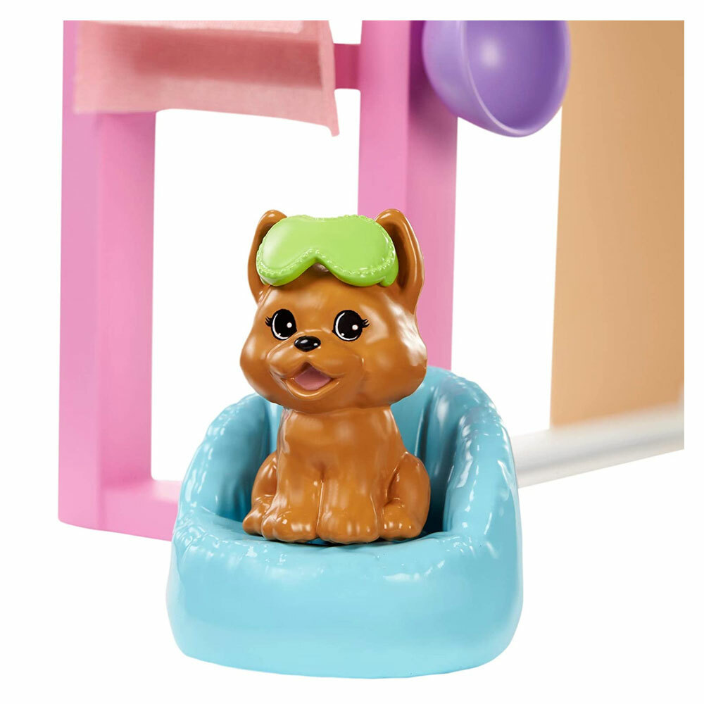 Bornoz ve terlik giyen Barbie bebek, yavru köpek, saklama alanları ve kalıplarıyla spa istasyonu, üç kutu Barbie