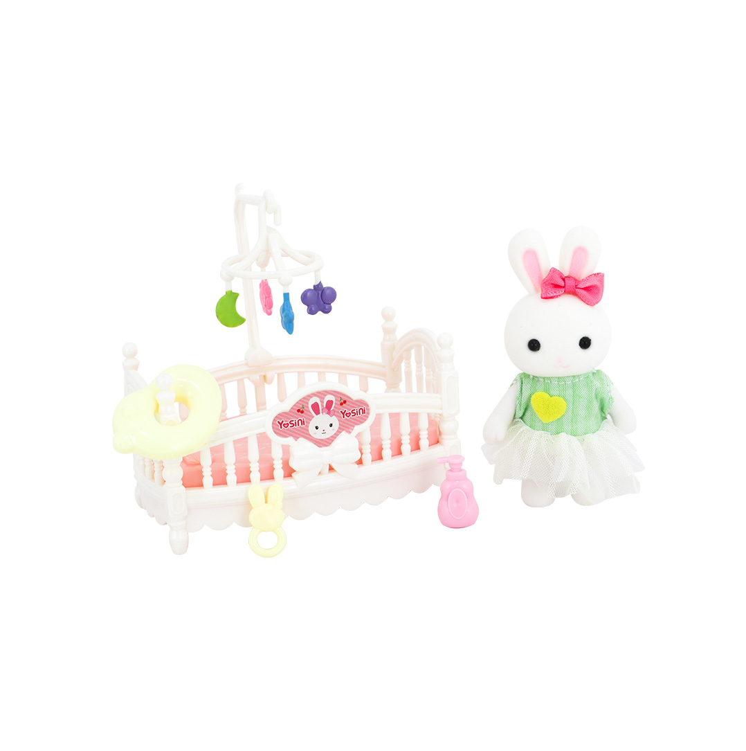 Bu minyatür tavşanın tasarımı, bir beşik, dönencesi, sabunluğu ve çıngırağı, yatağı ile birlikte gelen sevimli bir tavşandır.