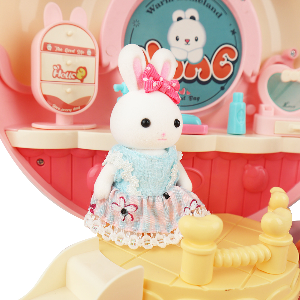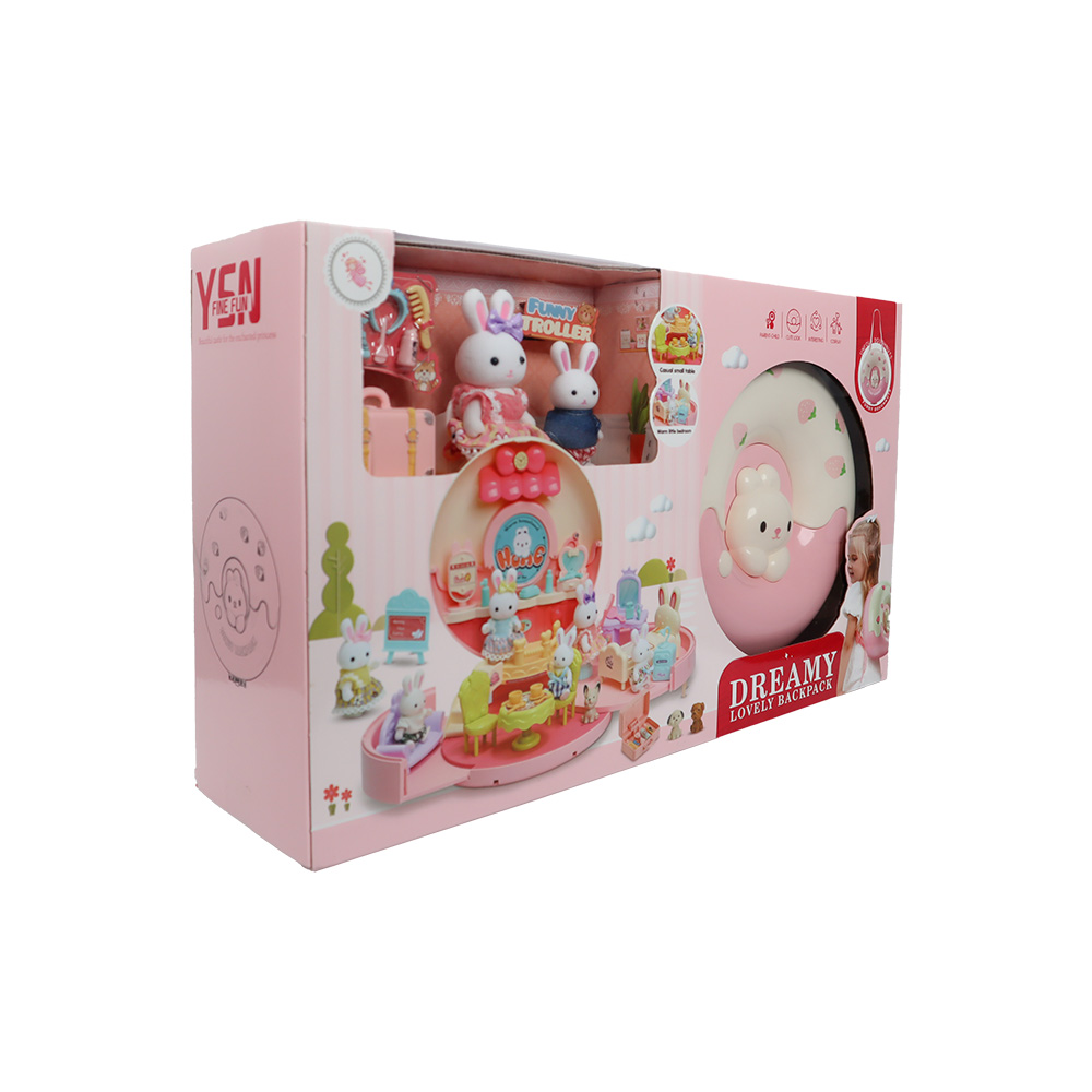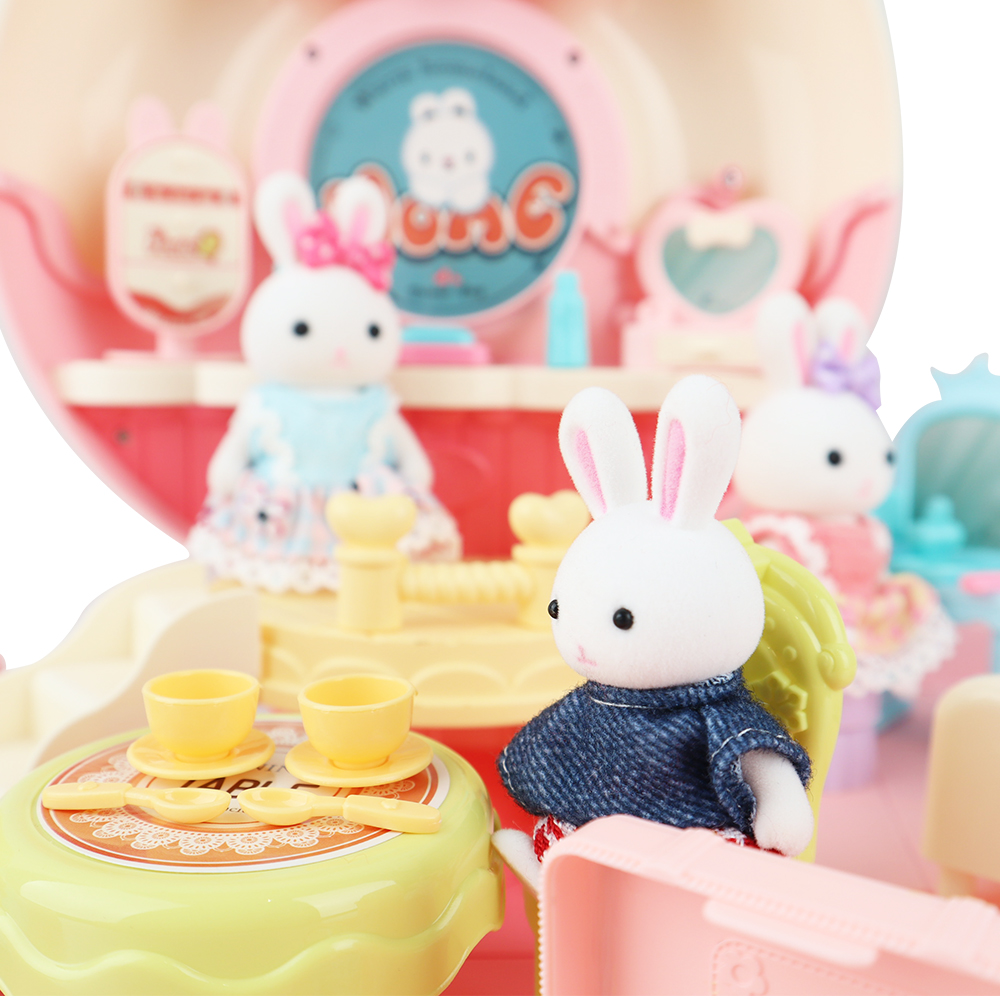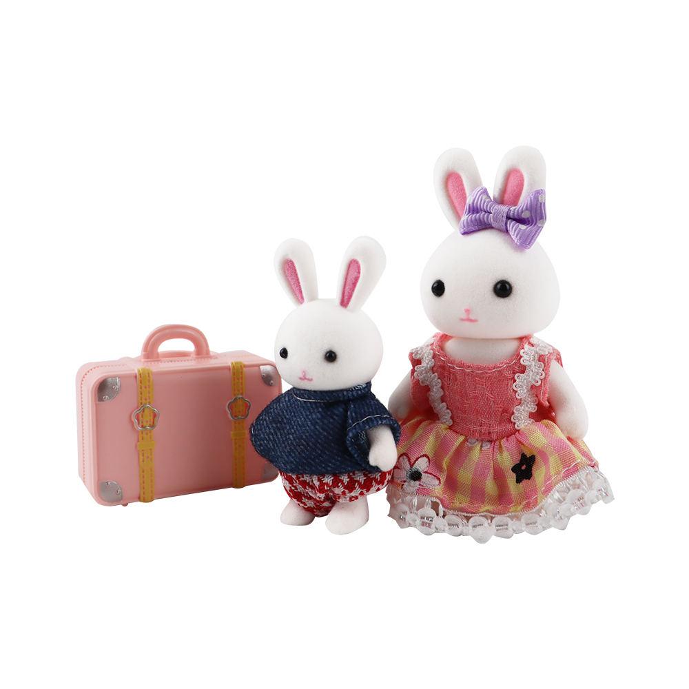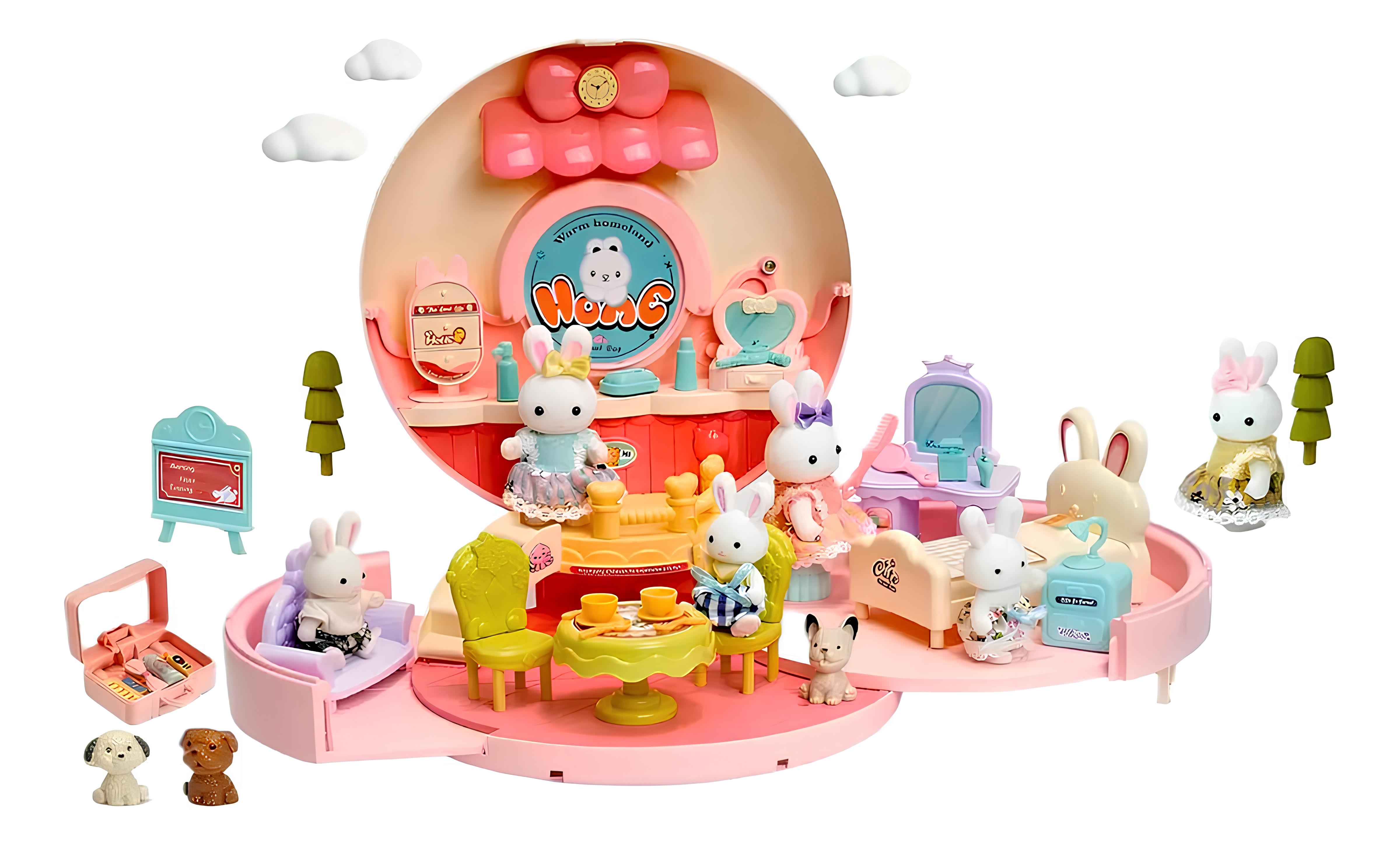 Oyun seti şunları içerir: İki tavşan, 2 köpek, sırt çantası, salon ve yatak odası takımı ve aksesuarlar.