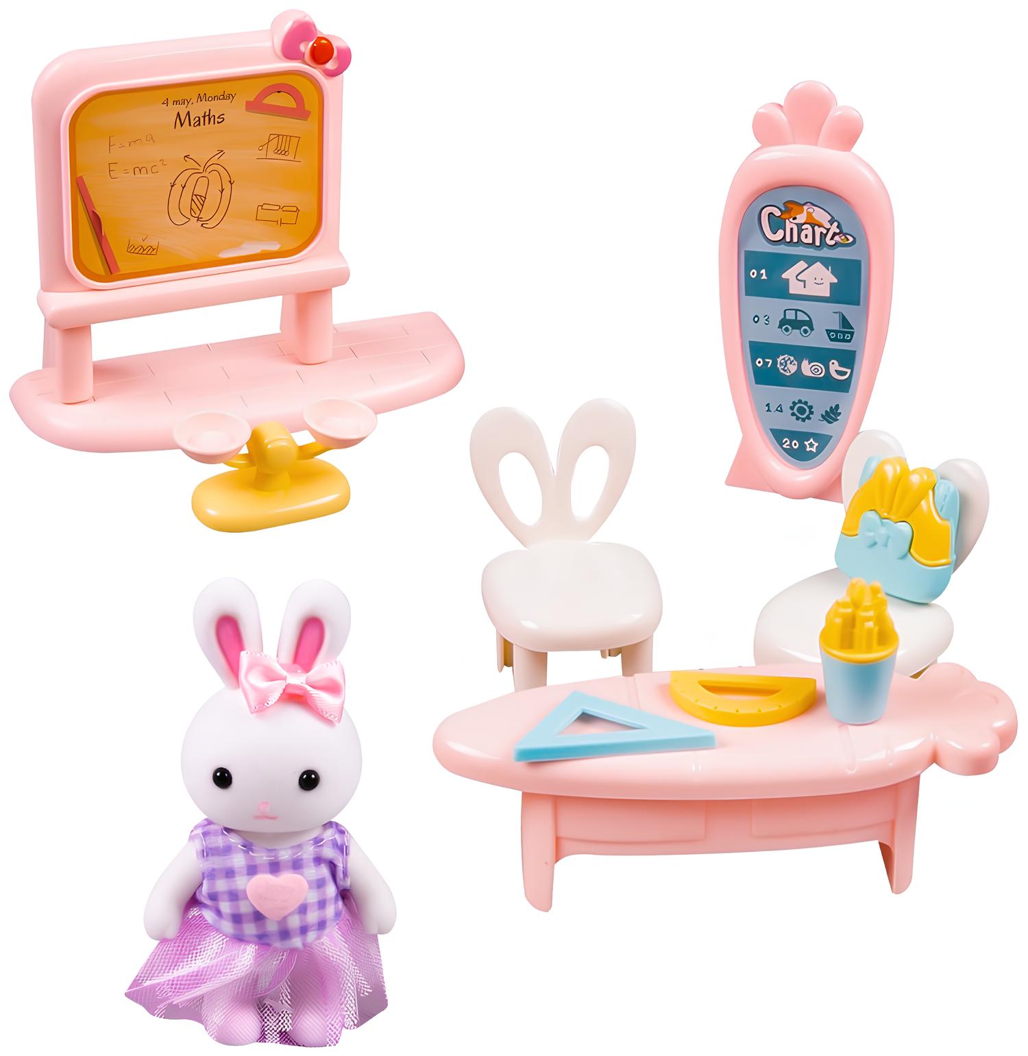 Bu minyatür tavşanın tasarımında, okul araç ve gereçleri, akıllı okul tahtası, sandalyeleri birlikte gelen sevimli bir tavşandır.