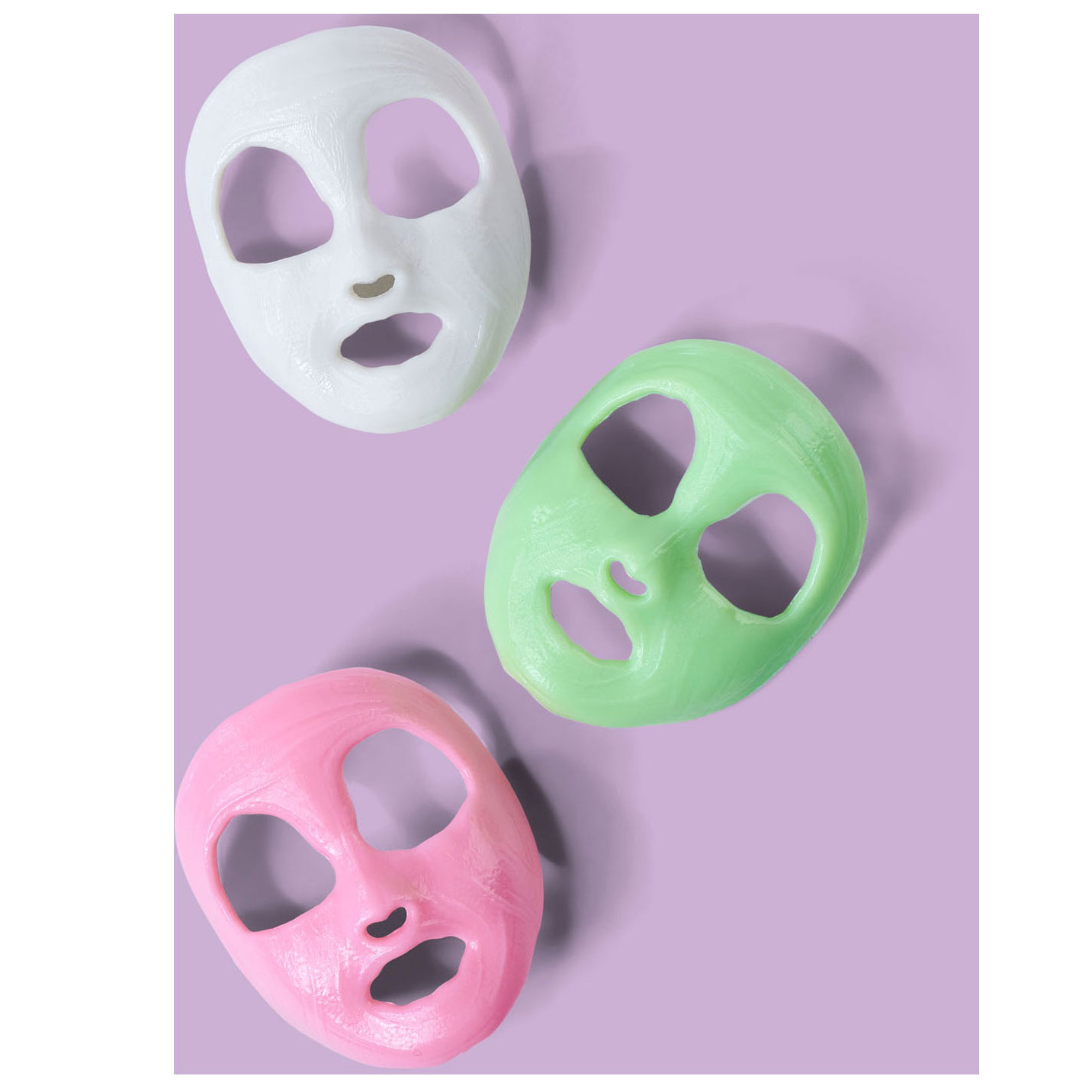 takılabilen üç yüz maskesi (beyaz, yeşil, pembe) içerir.
