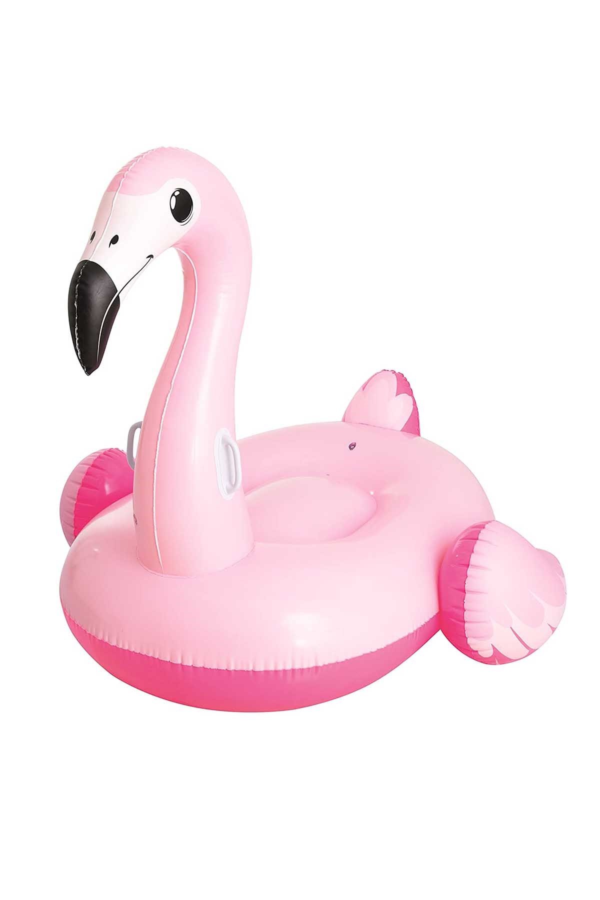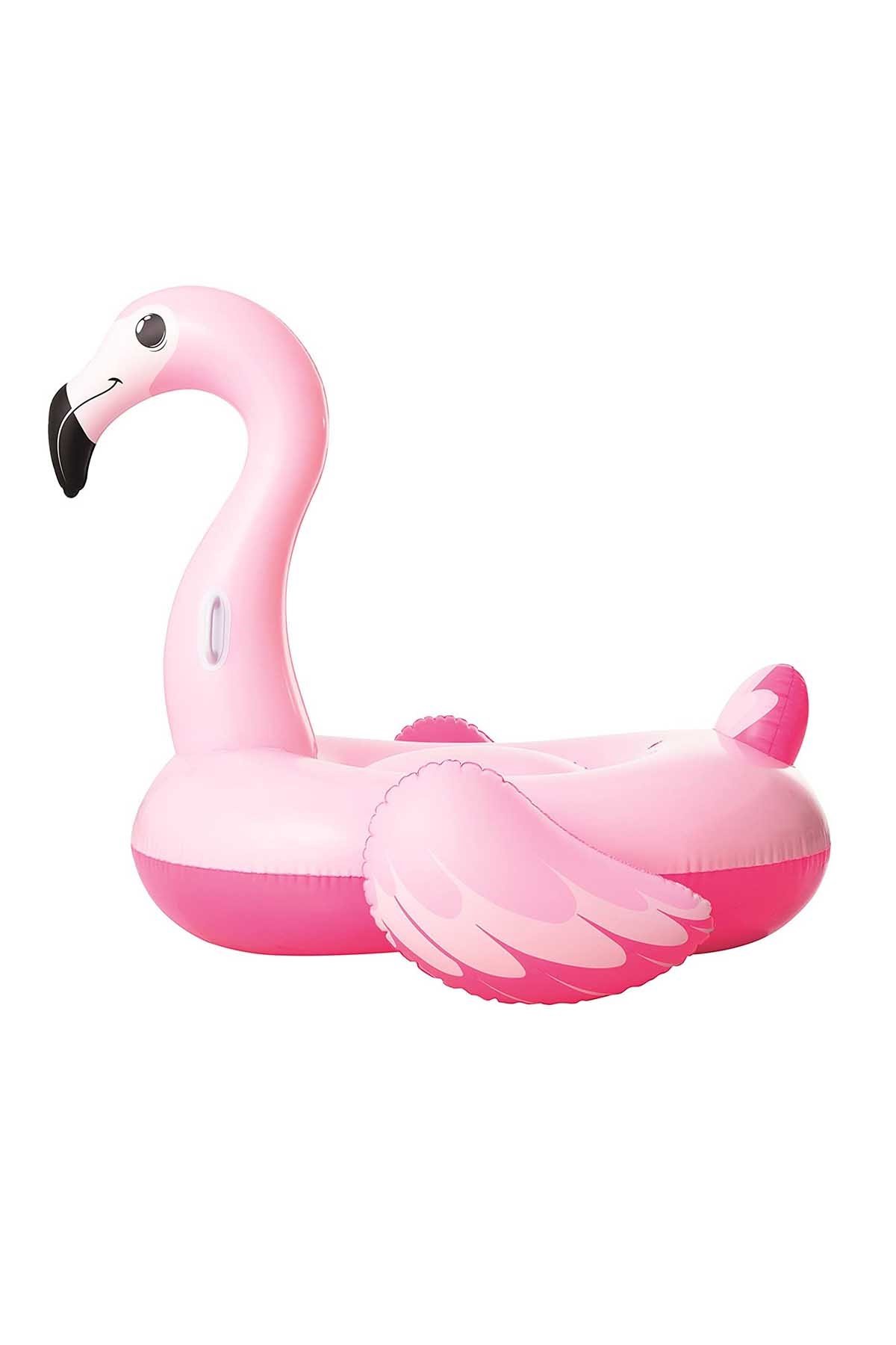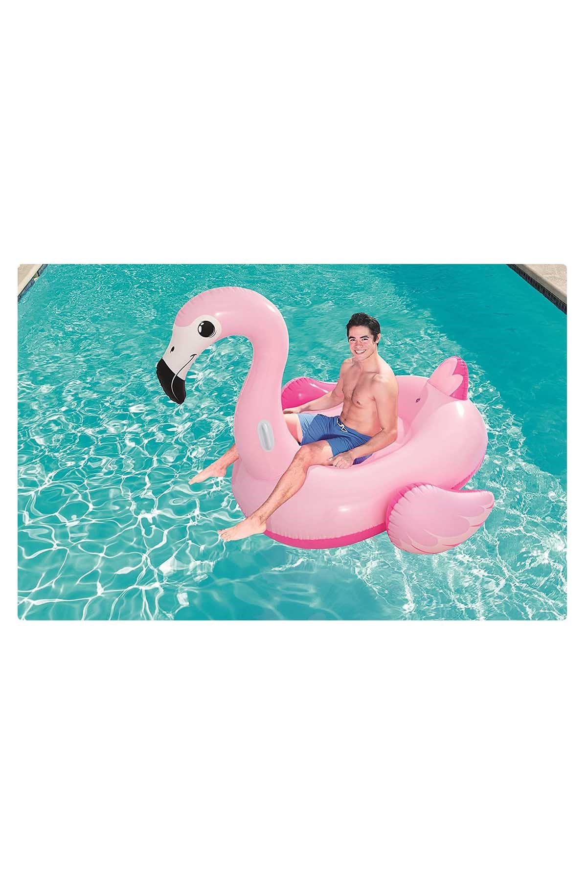 Bu şişirilebilir şamandıra, dengeyi korumak için şişirilmiş kanatlara ve tüylere sahip ekstra büyük bir flamingo kafasına sahiptir.
