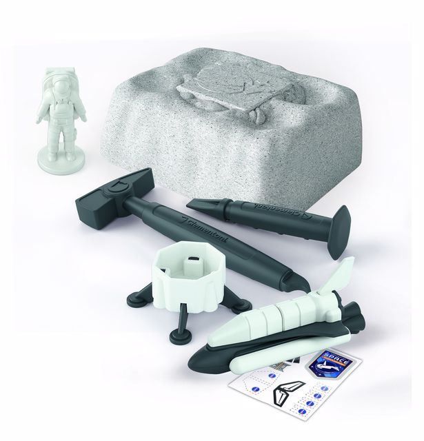aracı parçaları, astronot, çıkartmalar, taş örneği, çekiç, keski, kullanım kılavuzu.