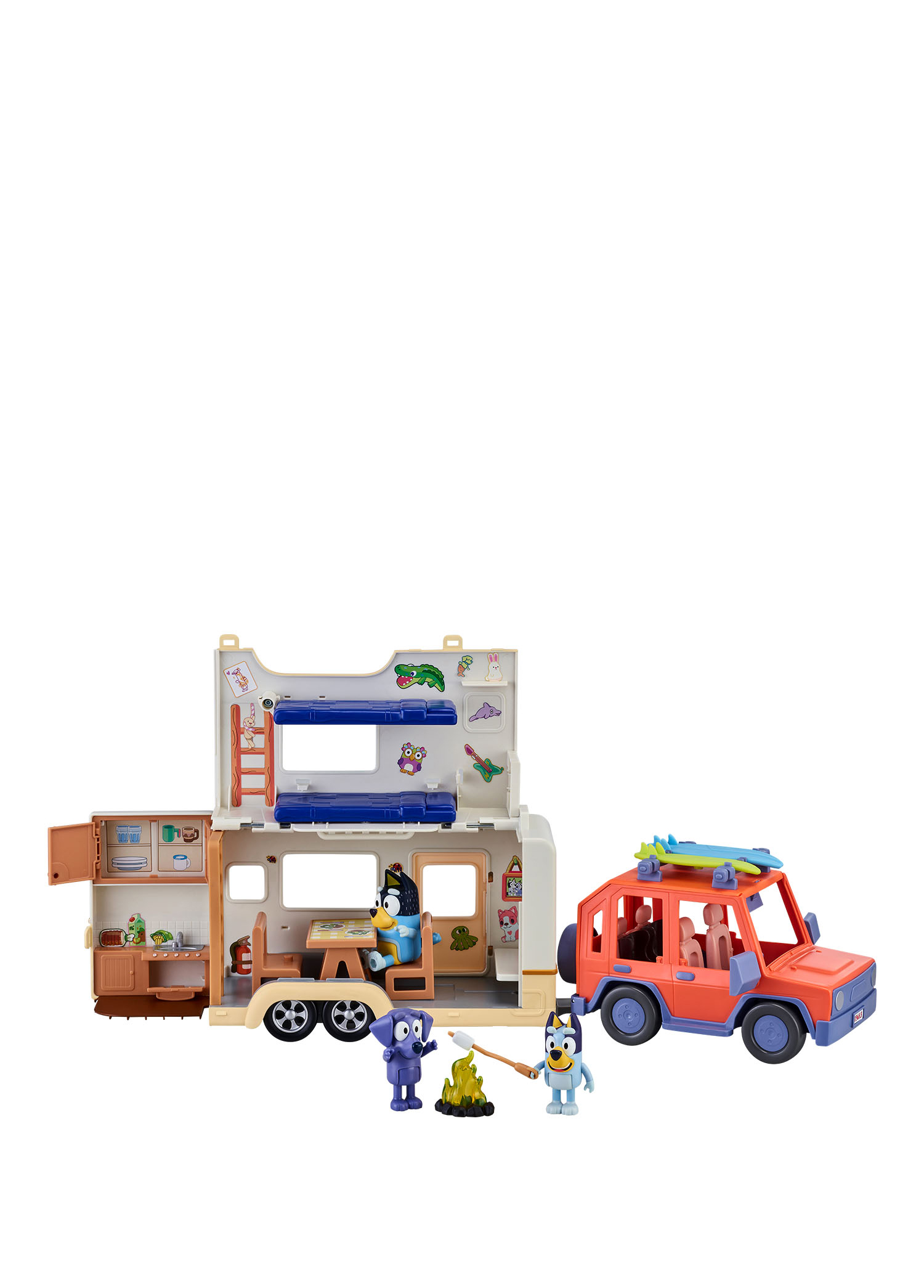 Bluey'nin muhteşem karavan macerası oyun seti, 4WD'yi bağlayıp karavan tatilinde yola koyulurken birçok özellik ve yapılacak şeyle dolu!