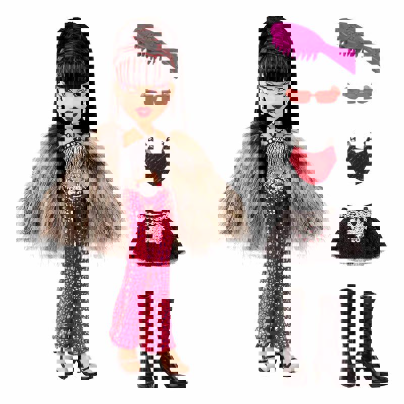 Ayrıca güneş gözlüğü, küpeler ve saç fırçası aksesuarları da dahil. Koleksiyonu tamamlamak için tüm Bratz seri 3 bebeklerini topla!