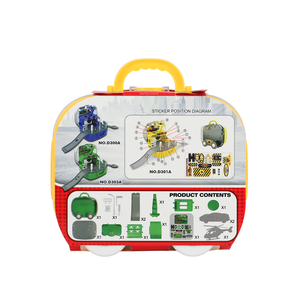 Oyun seti içeriğinde, 2 adet askeri araç, 360 derece dönebilen kule, otopark asansörü ve kurulum için gerekli oyun parçaları mevcuttur.