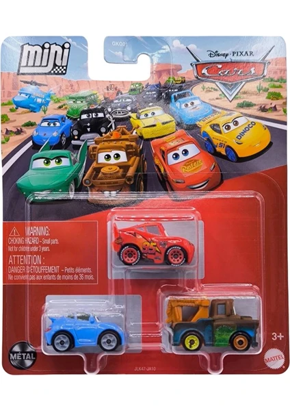Her temalı 3'lü paket, özel bir metal araba ve iki tamamlayıcı karakter aracı içerir.