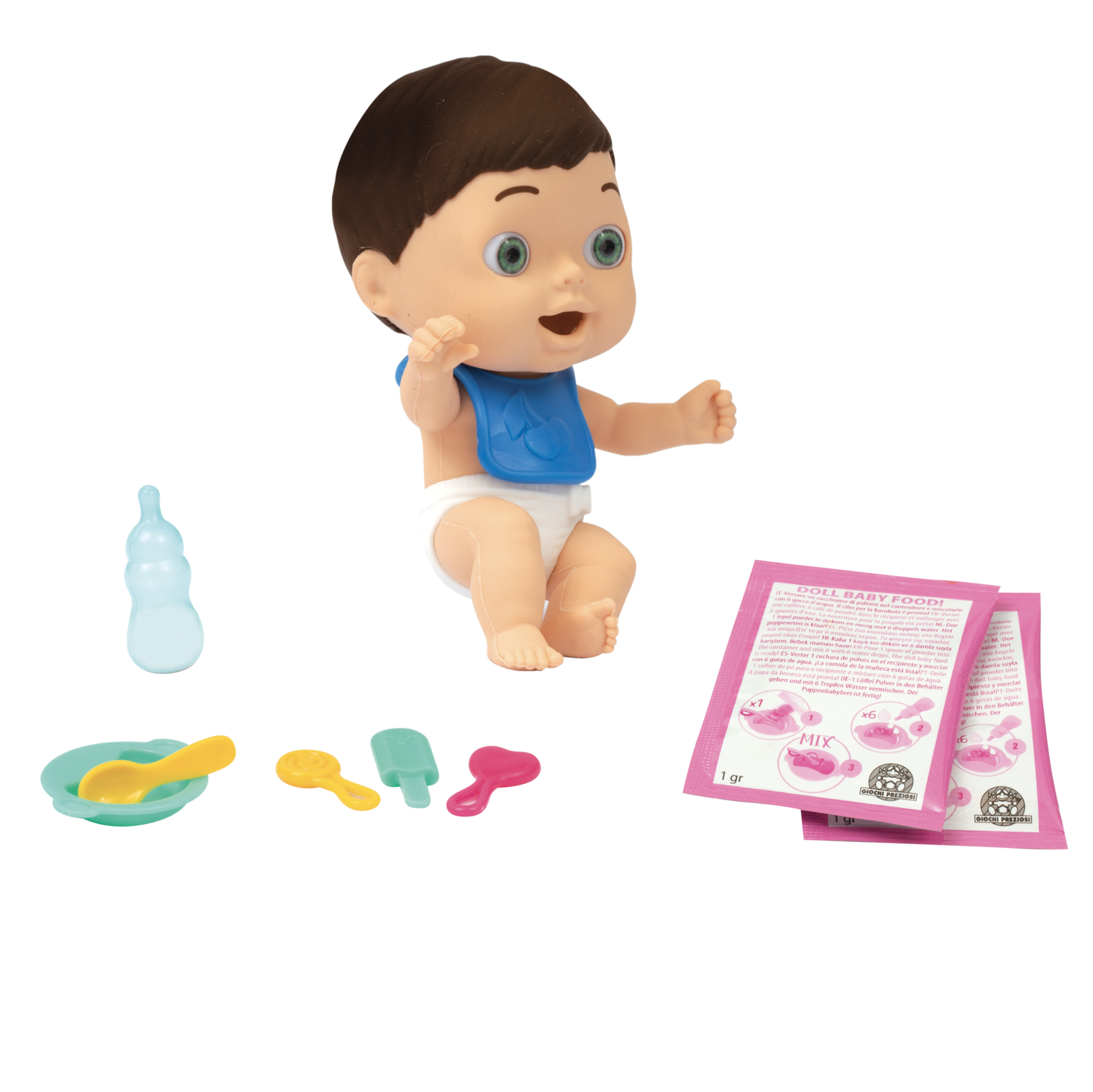 Paket içerisinde 1 Bebek, 1 Aksesuar ve 1 çıkarılabilir Bez’in yanı sıra 2 Mama Paketi, Tabak, Kaşık, Su Şişesi, Dondurma, Lolipop, Biberon’dan oluşan