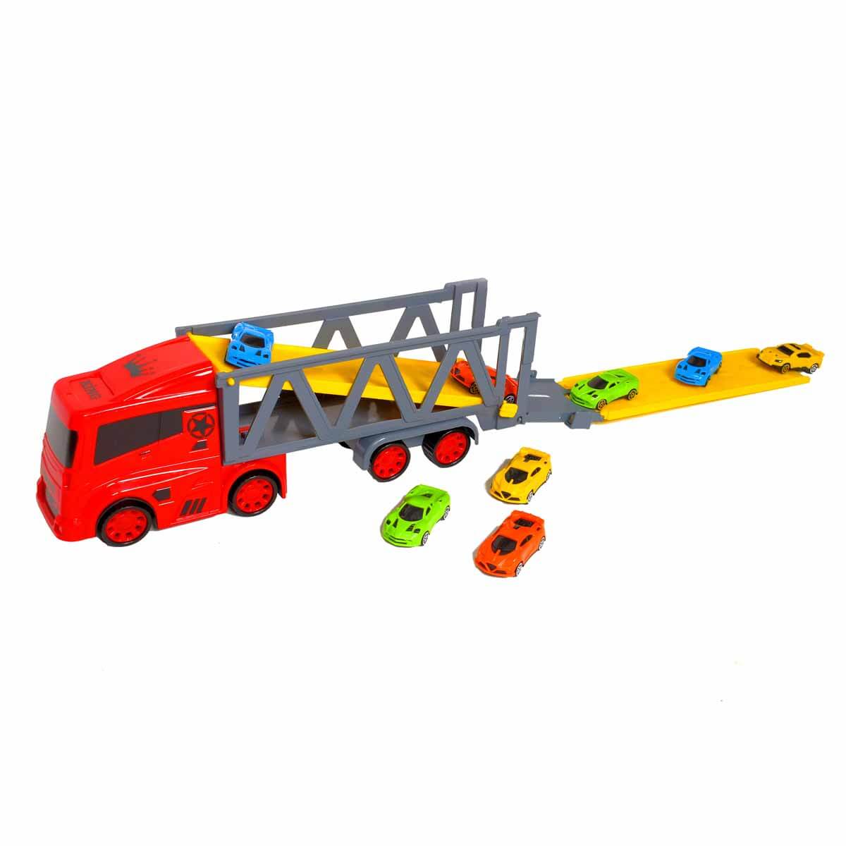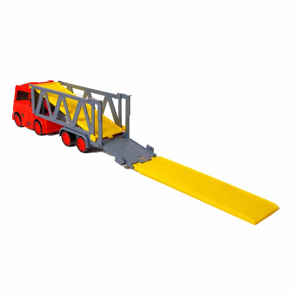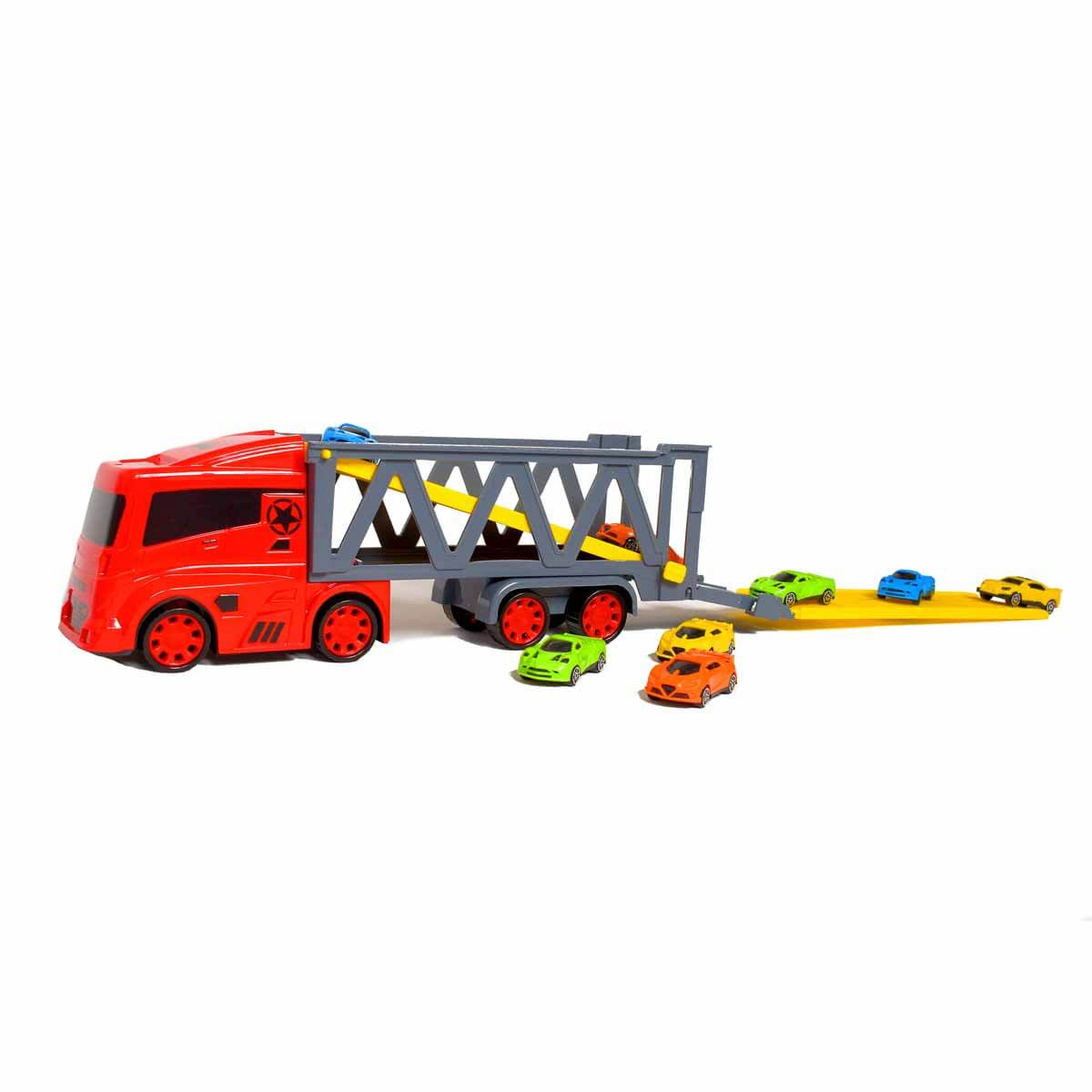 2 katlı yarış kamyonu pek çok arabayı aynı anda taşıyabilir. Bir sonraki yarış heyecanı için arabalarını kamyonuna yükle ve sonra yola çık. Kamyon, sürtmeli mekanizmaya sahiptir. Yola çıkmaya hazır olduğunda arabanı geriye doğru çek ve zafere emin adımlarla nasıl ilerliyor izle. Varacağın yere geldiğinde ise önce rampayı sonra arabalarını indir. 4 yarış arabası sana kupayı getirdikten sonra onunla birlikte arabaları tekrar kamyona yükle ve başka bir yarış için yollara düş.
