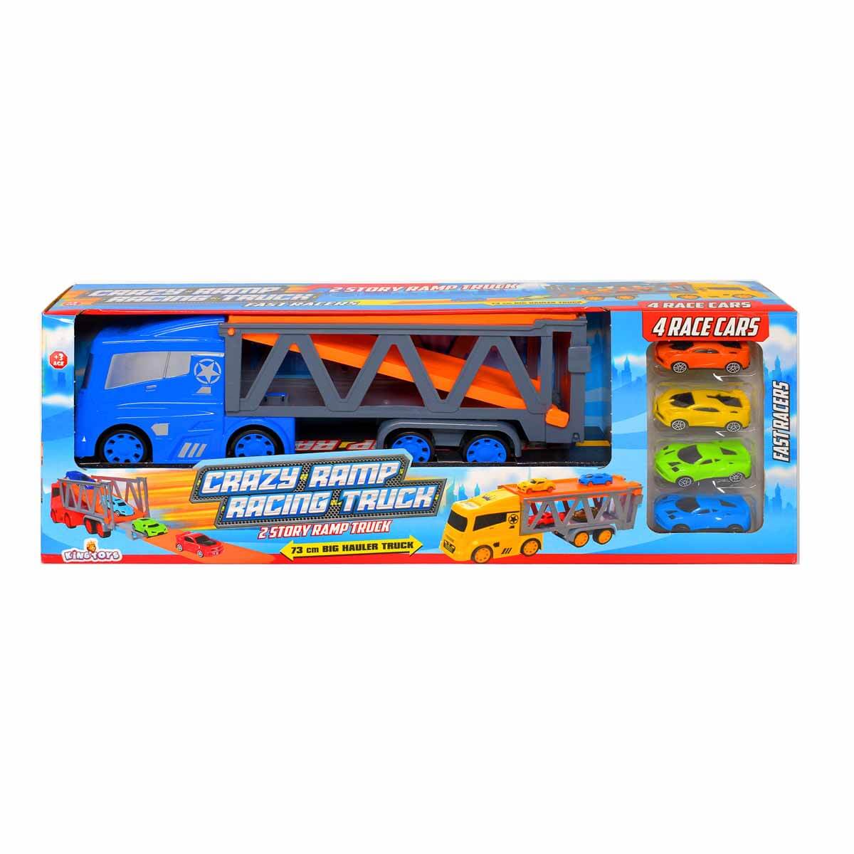 2 katlı yarış kamyonu pek çok arabayı aynı anda taşıyabilir. Bir sonraki yarış heyecanı için arabalarını kamyonuna yükle ve sonra yola çık. Kamyon, sürtmeli mekanizmaya sahiptir. Yola çıkmaya hazır olduğunda arabanı geriye doğru çek ve zafere emin adımlarla nasıl ilerliyor izle. Varacağın yere geldiğinde ise önce rampayı sonra arabalarını indir. 4 yarış arabası sana kupayı getirdikten sonra onunla birlikte arabaları tekrar kamyona yükle ve başka bir yarış için yollara düş.