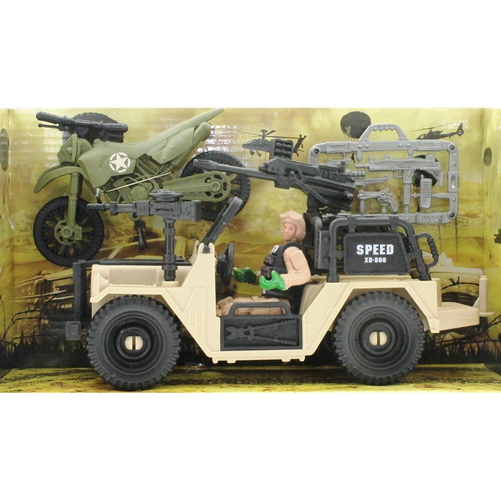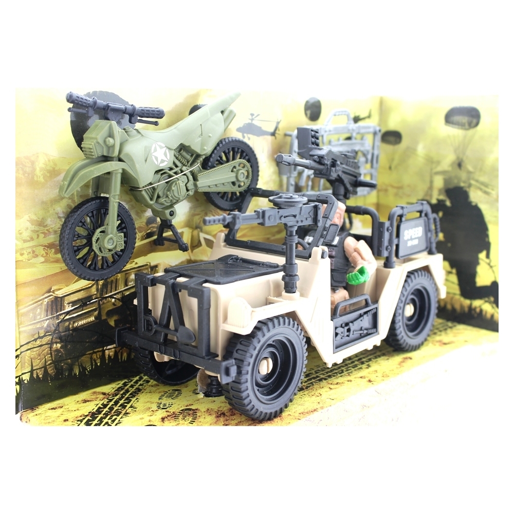 Bu set 1 askeri jeep, 1 asker figürü ve 1 motor ve silahlardan oluşmaktadır.