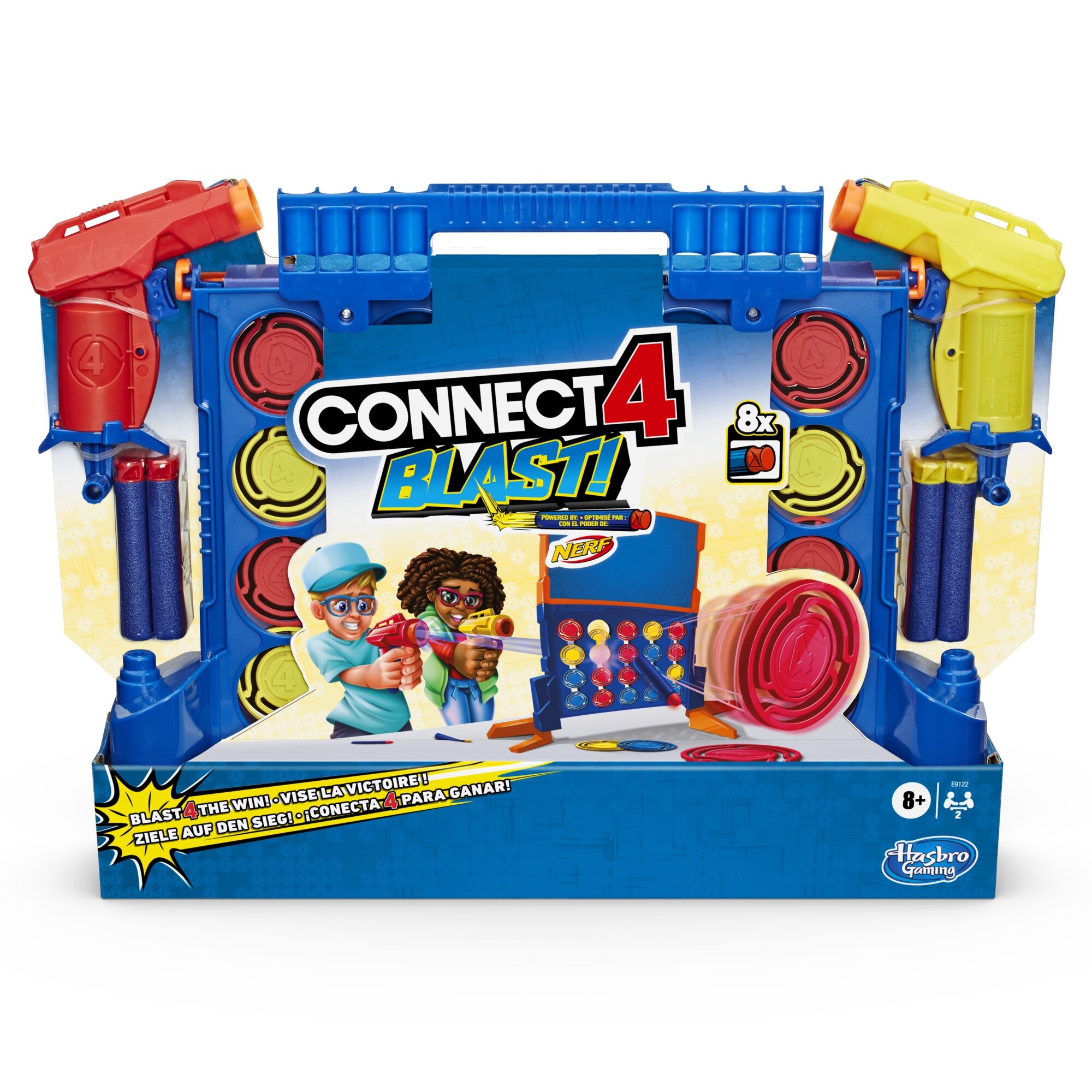 İki oyuncuyla oynanan Connect 4 Blast!’ın kutusuna oyun alanını oluşturan parçalar, 2 Nerf dart tabancası, 8 Nerf dart ve mavi, sarı, kırmızı renklerde 40 disk dahil.