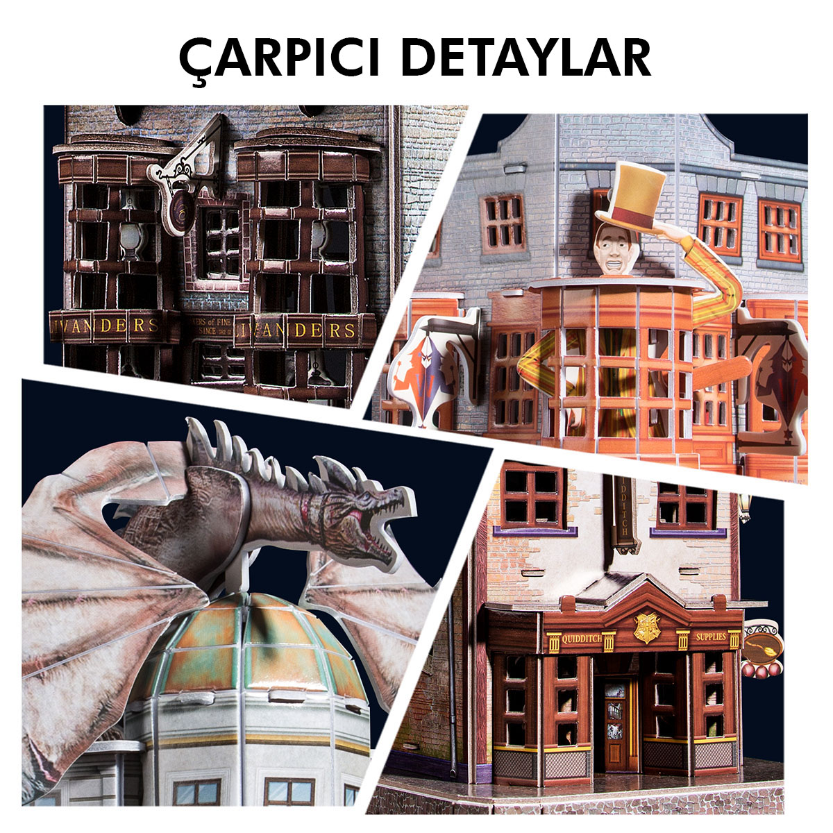 Quidditch kaliteli ürünler dükkanı, Olivanders asa dükkanı ve Zonko şaka