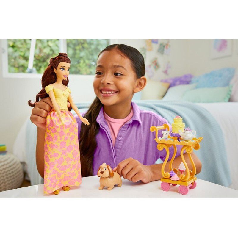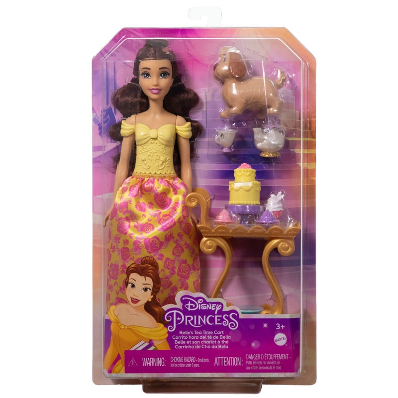 Kendine özgü sarı rengiyle parıldayan bu sevimli Belle bebeği, bir çay arabası, sevilen karakter arkadaşları ve oyuncak yiyeceklerle birlikte gelir.
