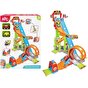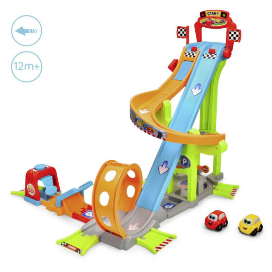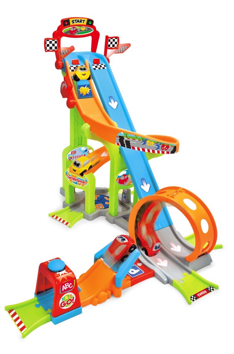 Bu dinamik araba oyun seti, küçük yarışçıları saatlerce eğlendirecek rampalar, halkalar ve zıplamalar içeren heyecan verici çok katlı bir kuleye sahiptir.