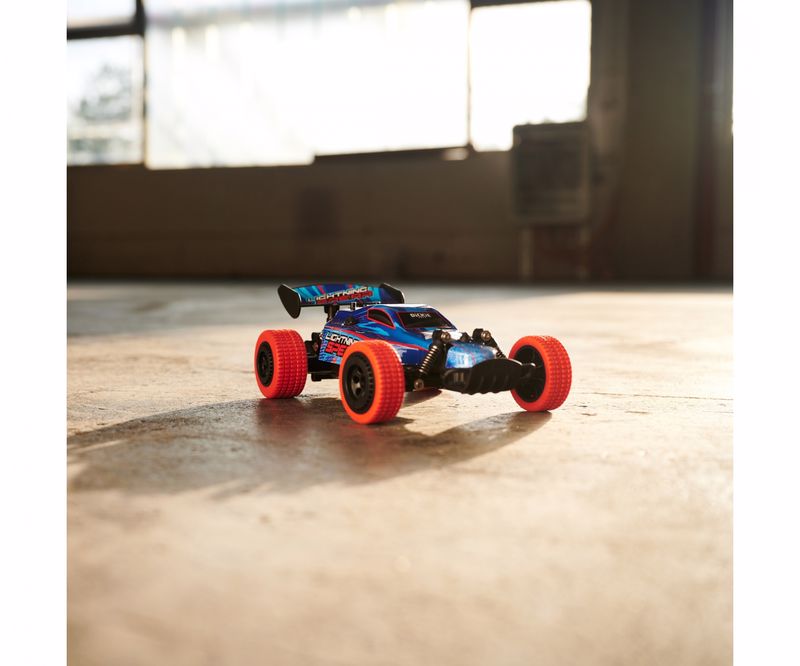 Dinamik ön ve arka süspansiyona ek olarak araç, hızlı tempolu yarışlarda dengesini ve yol tutuşunu koruması için sağlam profilli lastiklere de sahip. Parkurdan çıkarsanız, darbeye dayanıklı tampon, buggy'nin güvenli bir şekilde bitiş çizgisine ulaşmasını sağlayacaktır.