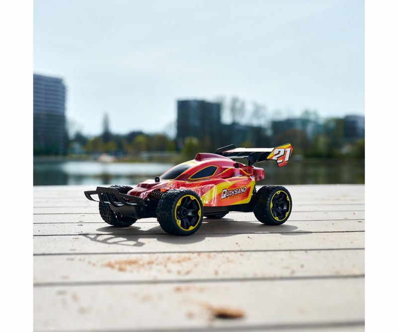 Oyuncak araç, kullanımı kolay ve neredeyse her yeri kendi heyecan verici yarış parkurunuza dönüştürmenizi sağlayan bir uzaktan kumandayla (2 kanal, 27 MHz) gelir.