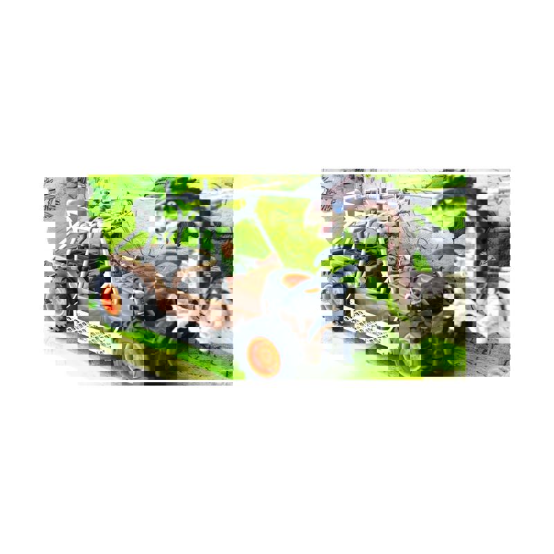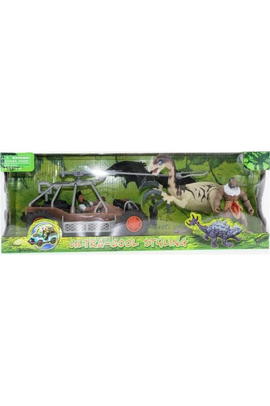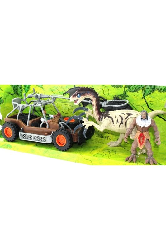 Set içerisinde buggy,dinozor, tarih öncesi insan figürü,