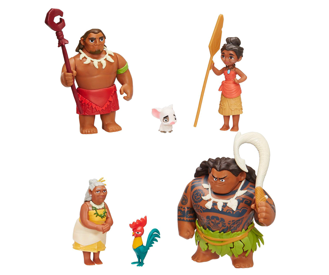 Disney Moana Küçük Figür Koleksiyon Seti’nde Moana, Maui, Moana’nın hayvan arkadaşları Pua ve Hei Hei’nin yanı sıra Moana’nın babası Şef Tui ve büyükannesi Tala’nın figürleri yer alıyor.