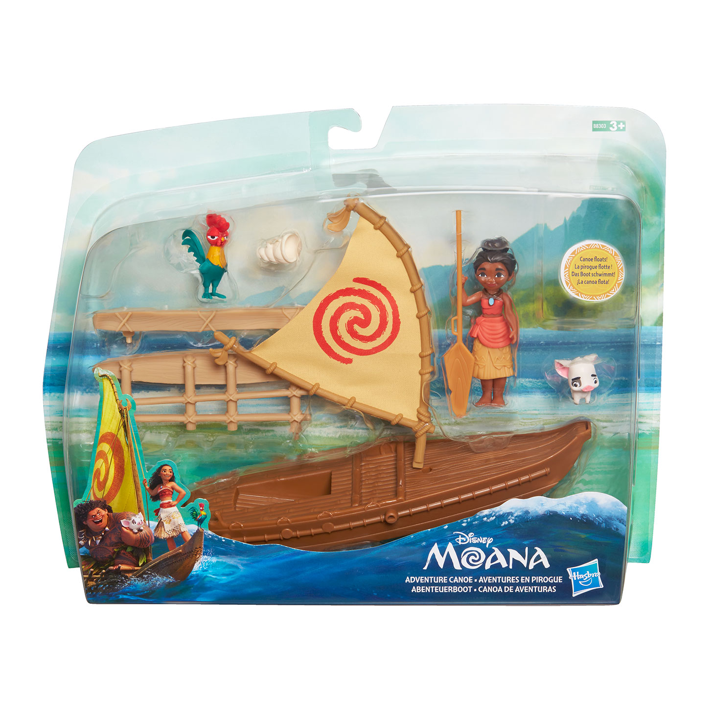 Moana’nın kanosu suda yüzebiliyor. Pakete oyun seti, çıkarılabilir kolyesi ile Moana’nın figürü, Hei Hei ve Pua’nın figürleri ve 2 aksesuar dahil.