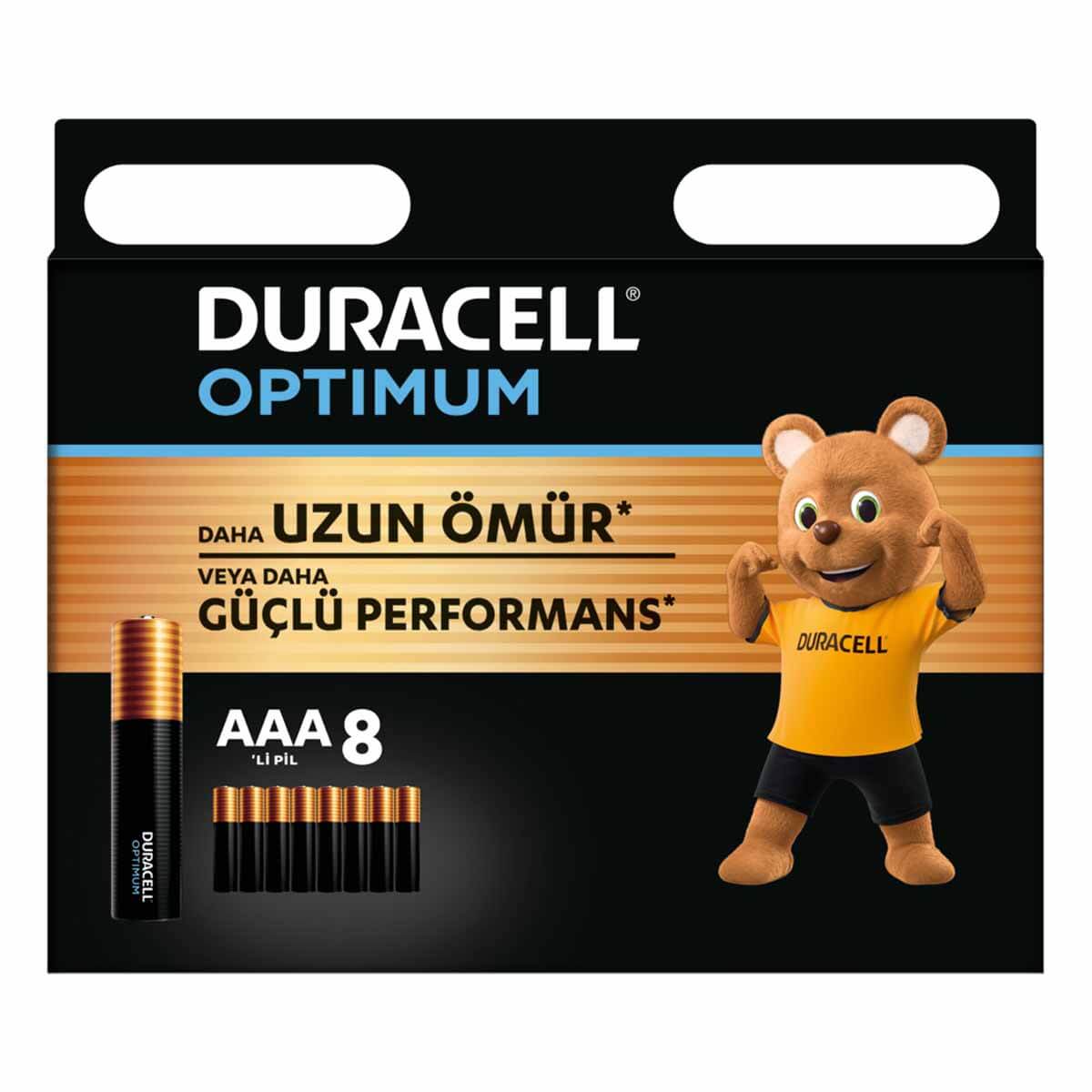 Duracell Optimum piller AA ve AAA formatlarında üretilir. 2015 IEC oyuncak testindeki (www.iec.ch) Minimum Ortalama Süresine kıyasla AAA boyutlu pillerde daha uzun ömür sağlar. Sonuçlar cihaza veya kullanım şekline göre değişebilir.