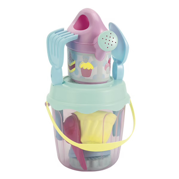 İçinde elek, dubleks, sulama kabı ve kek ve dondurma şeklinde 3 kum kalıbı bulunan şeffaf pembe kova.